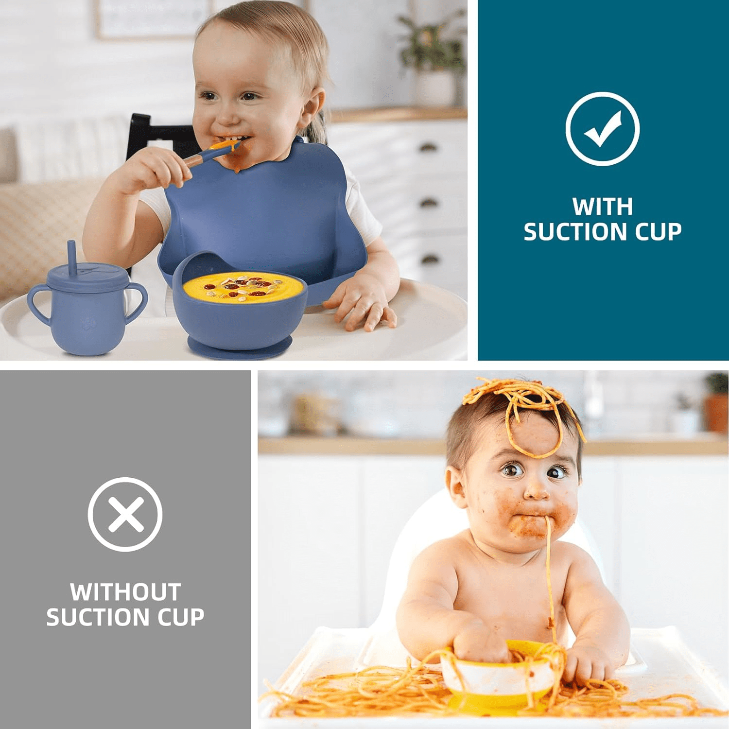 - 9-Piece Silicone Baby Feeding Set: Our premium silicone baby feeding set includes everything necessary for your little one’s mealtime, featuring an adjustable bib with a food catcher, a divided suction plate, a suction bowl, a training straw sippy cup, and two sets of spoons and forks. This comprehensive kit is designed to facilitate self-feeding, making it ideal for toddlers and young children.