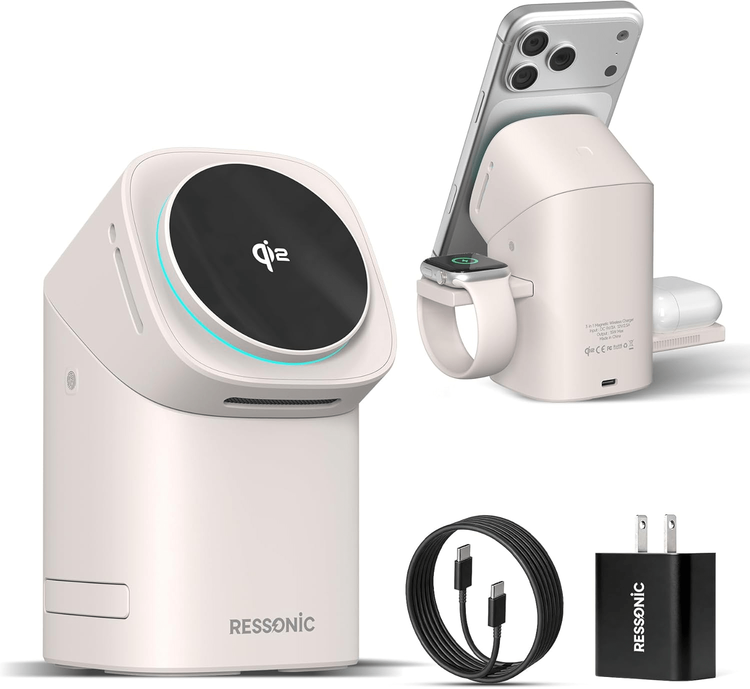 - Introducing the 3-in-1 Wireless Charging Station, an ideal solution for seamlessly charging your iPhone, Apple Watch, and AirPods in one compact space. Utilizing the advanced Qi2 technology, this charging dock provides a robust 15W magnetic fast charging for MagSafe-compatible iPhones, ensuring swift and efficient power delivery. Its elegantly designed desert color complements any modern workspace, be it your bedside table, office desk, or while on the go. With its space-saving abilities, you can effortlessly declutter your surroundings while maintaining a steady power supply for all your devices.