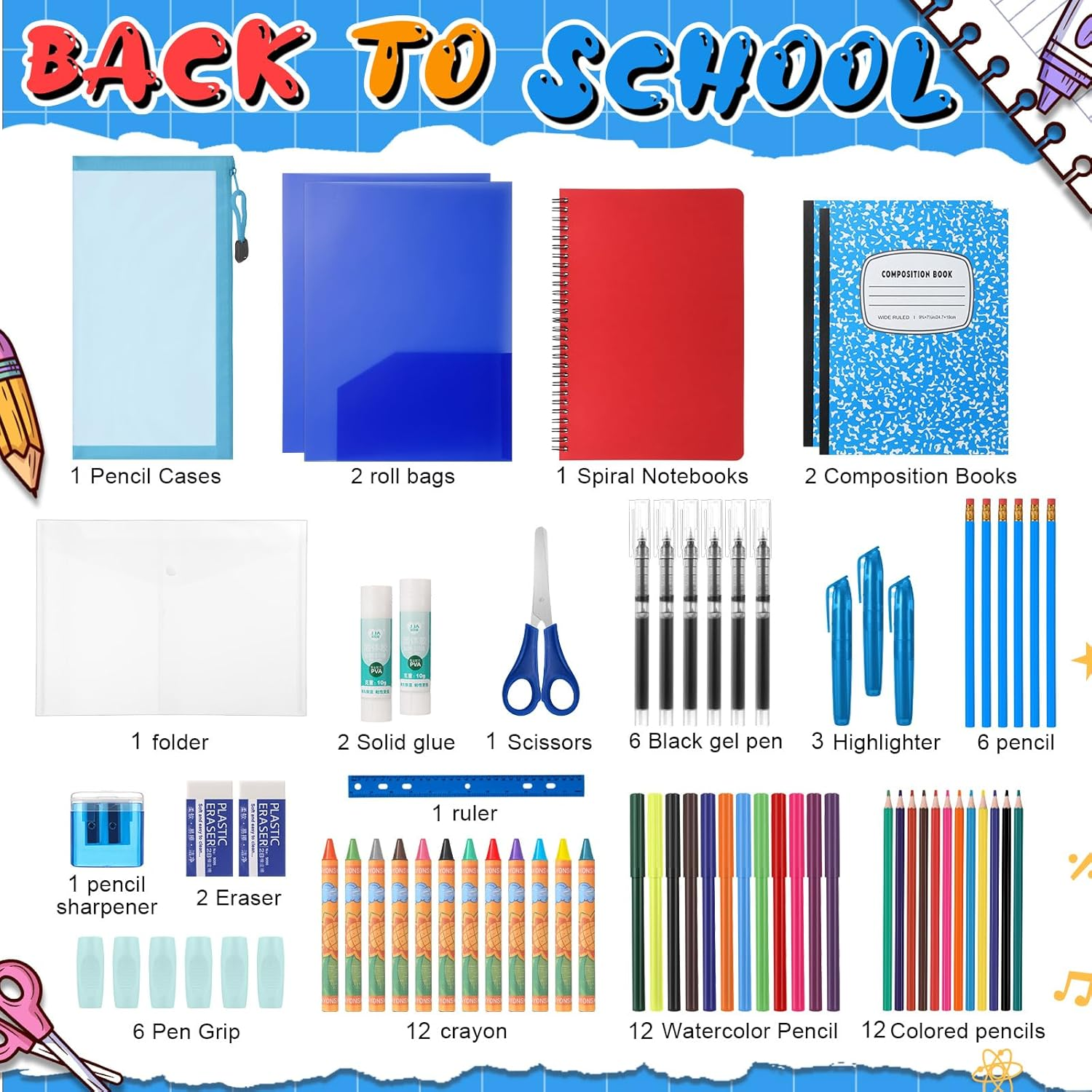 - Package Included: This comprehensive back-to-school supplies bundle includes 39 essential items, featuring 6 pencils, 2 glue sticks, 1 pair of scissors, 1 ruler, 3 erasers, 3 highlighters, a box of 12 colored pencils, a set of 12 watercolor pens, a box of 12 crayons, a sharpener, a pencil case, 2 composition notebooks, 1 B5 notebook, 6 black gel pens, 2 pouch bags, 6 ergonomic pencil grips, and a folder. This all-in-one set ensures that young learners have everything they need for a successful start in the new school year.