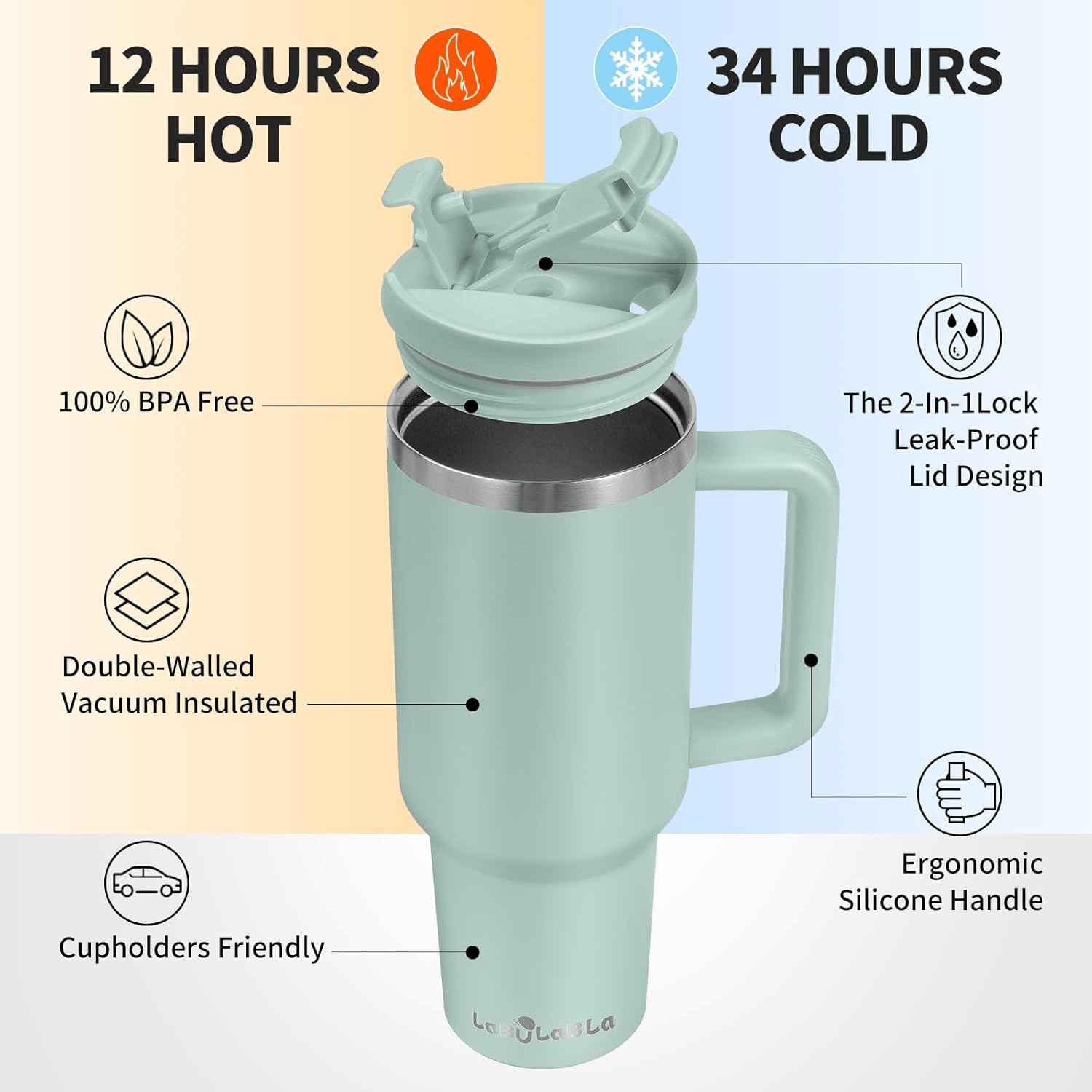 – Keeps drinks cold for up to 34 hours and hot for up to 12 hours