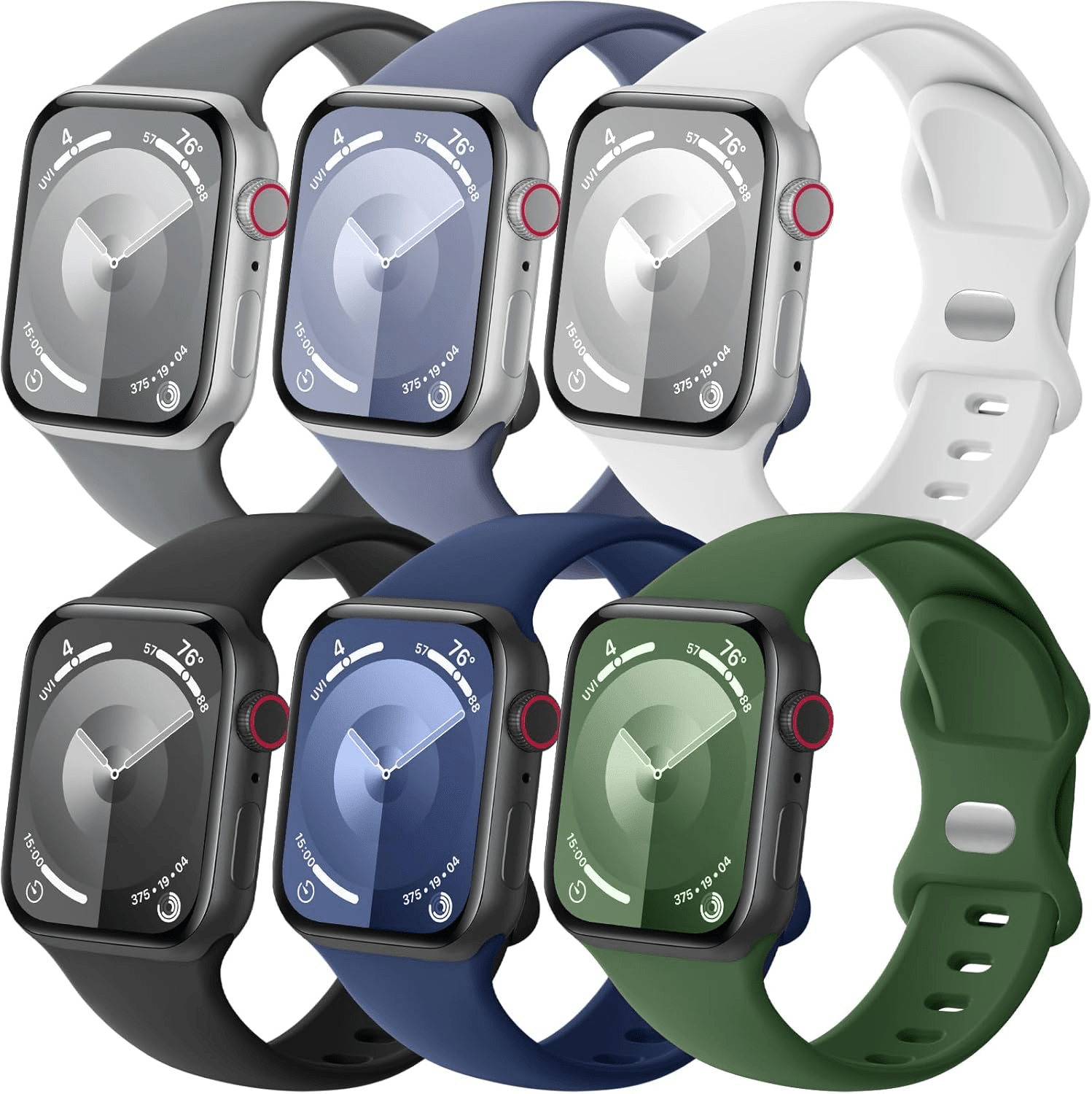 The 6 Pack Sport Bands are designed to provide versatility and style for Apple Watch users across a wide range of sizes, including 38mm, 40mm, 41mm, 42mm, 44mm, 45mm, 46mm, and 49mm. Crafted from high-quality soft silicone, these bands are not only comfortable for extended wear but also waterproof, making them ideal for various activities—from intense workouts to outdoor adventures. With six stunning color options to choose from, including Black, Navy Blue, Dark Green, Space Gray, Blue Gray, and White, you can easily switch up your style to suit different occasions or moods.