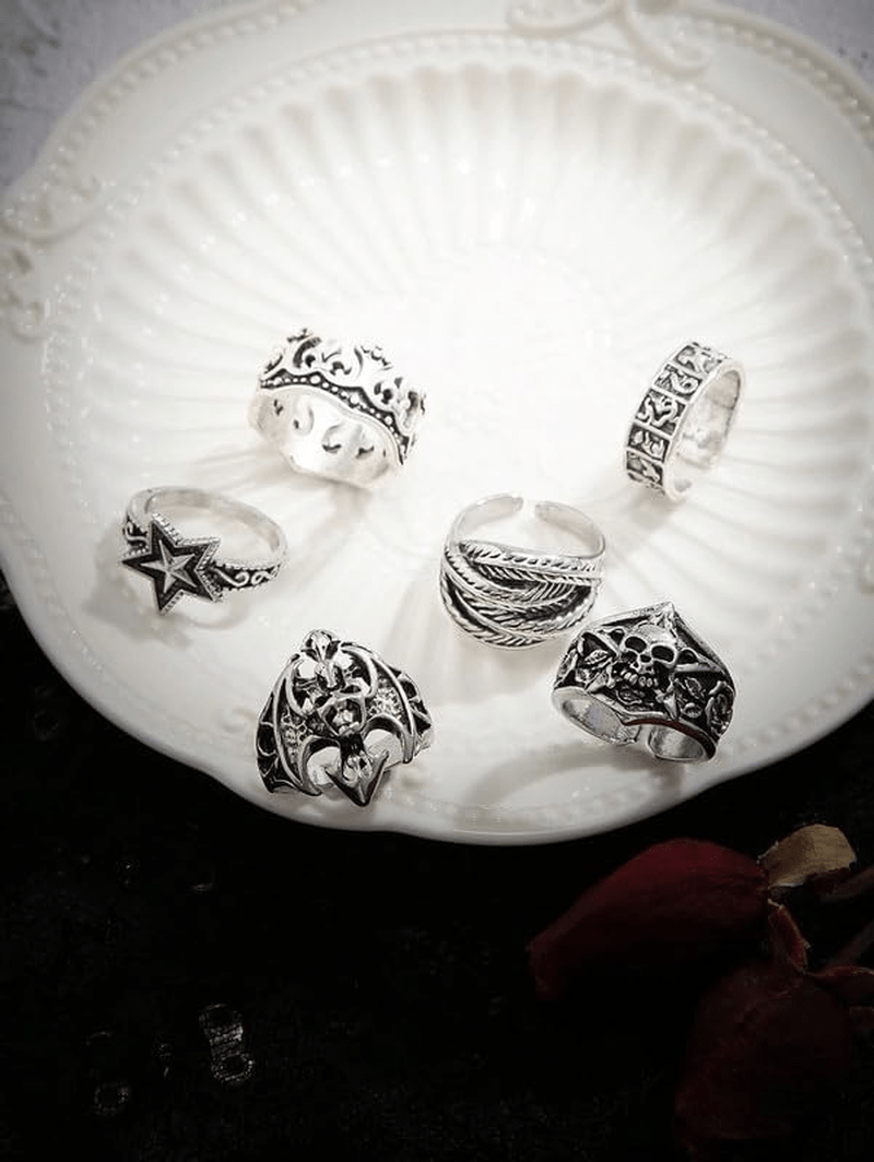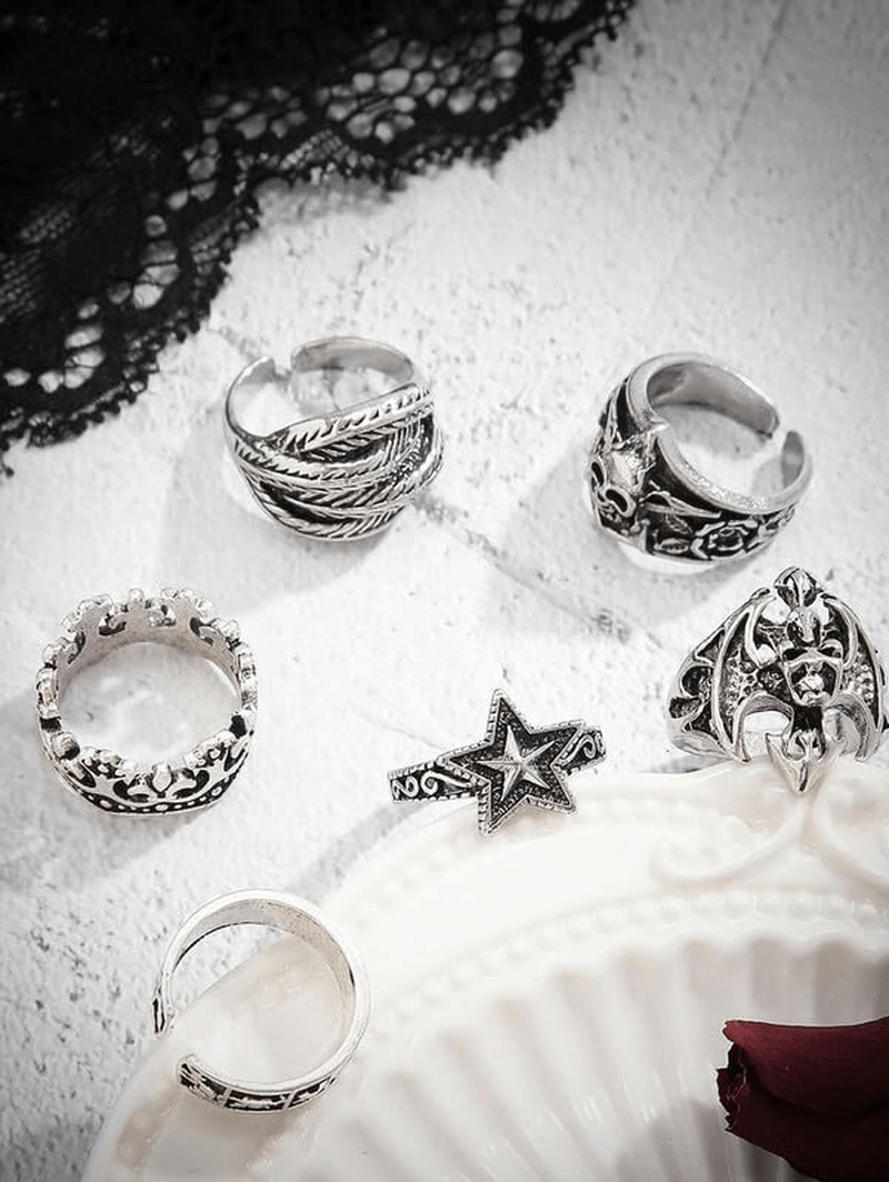 – Set includes 6 intricately designed chunky rings that can be worn together or separately