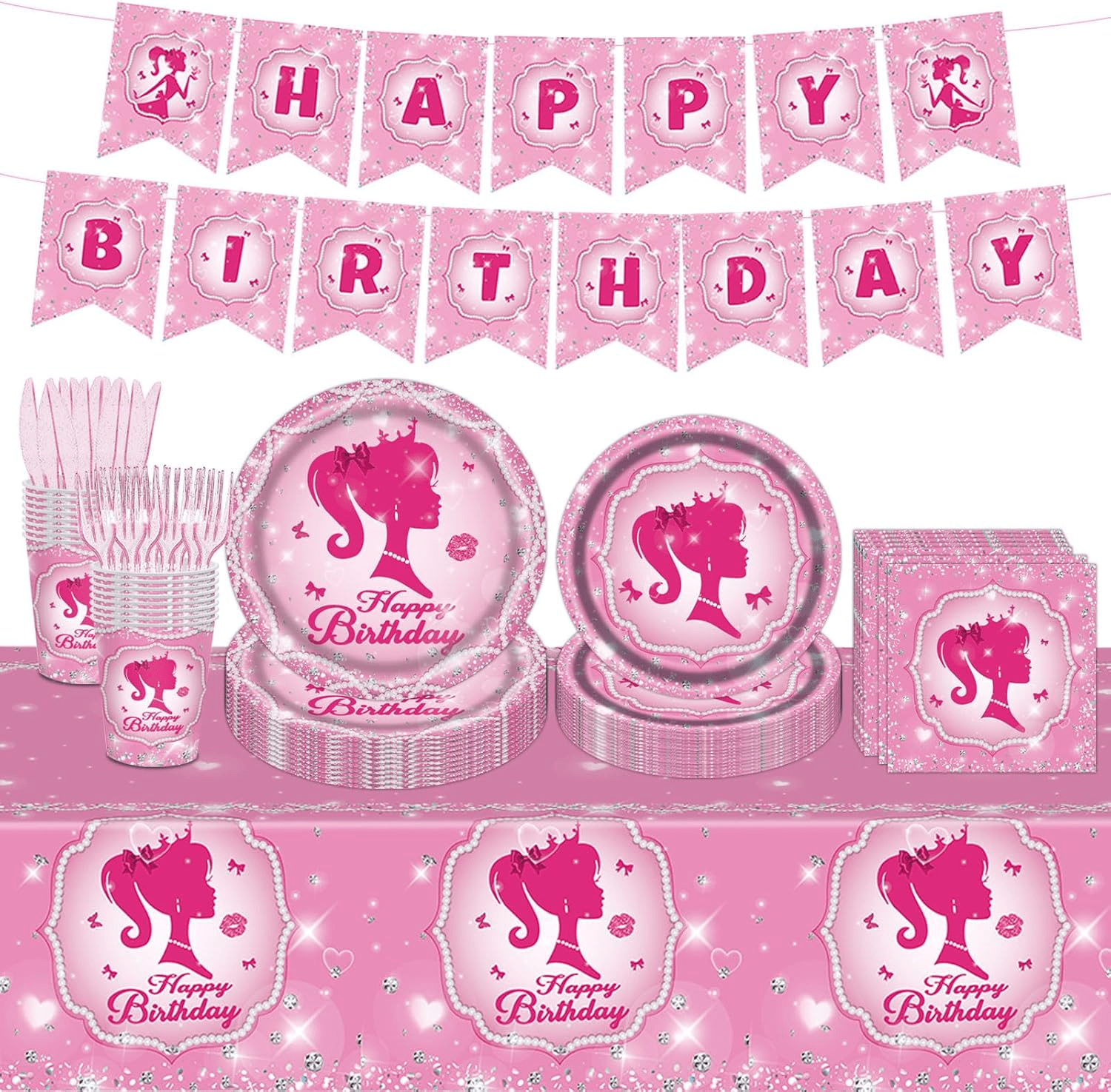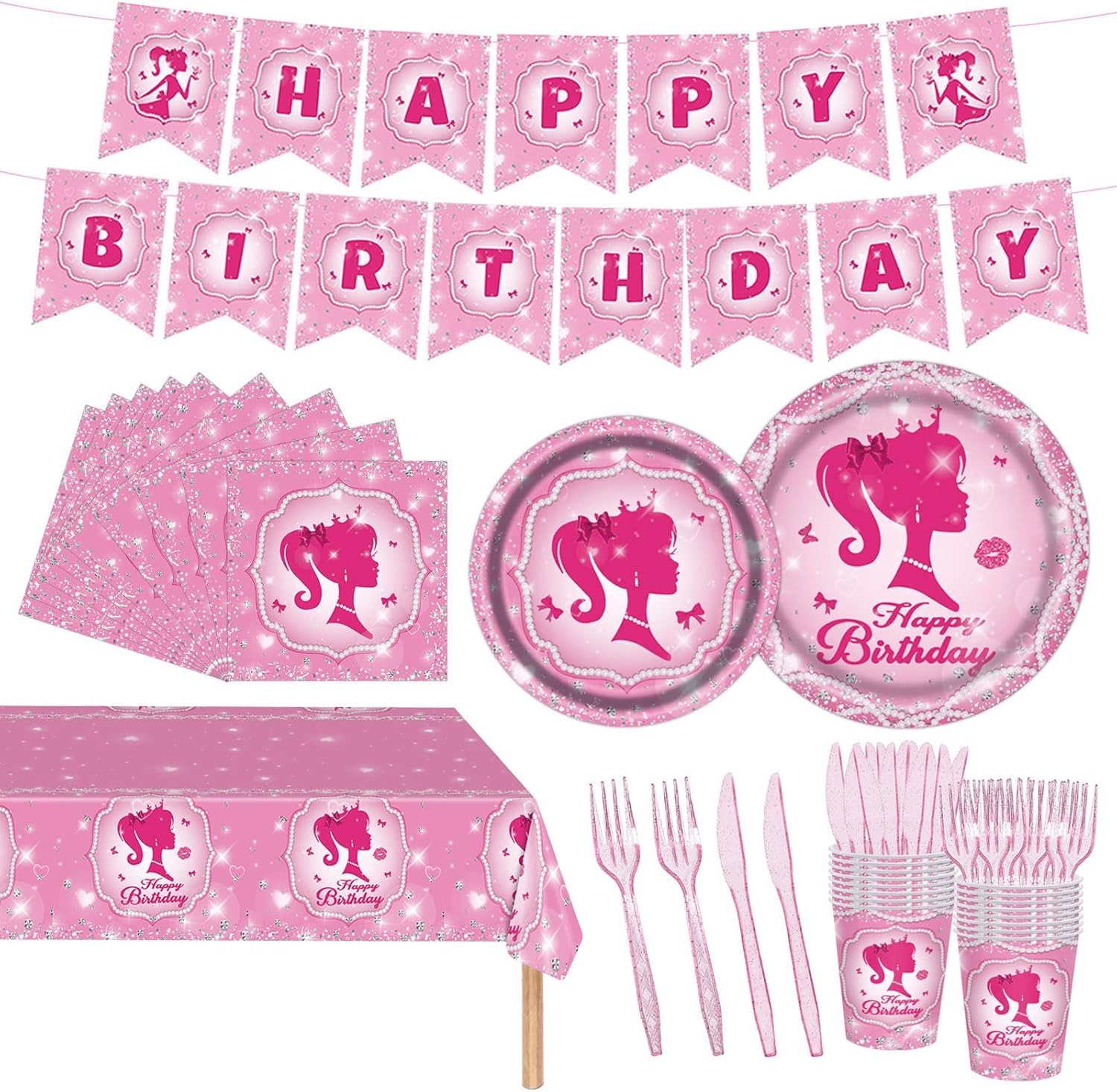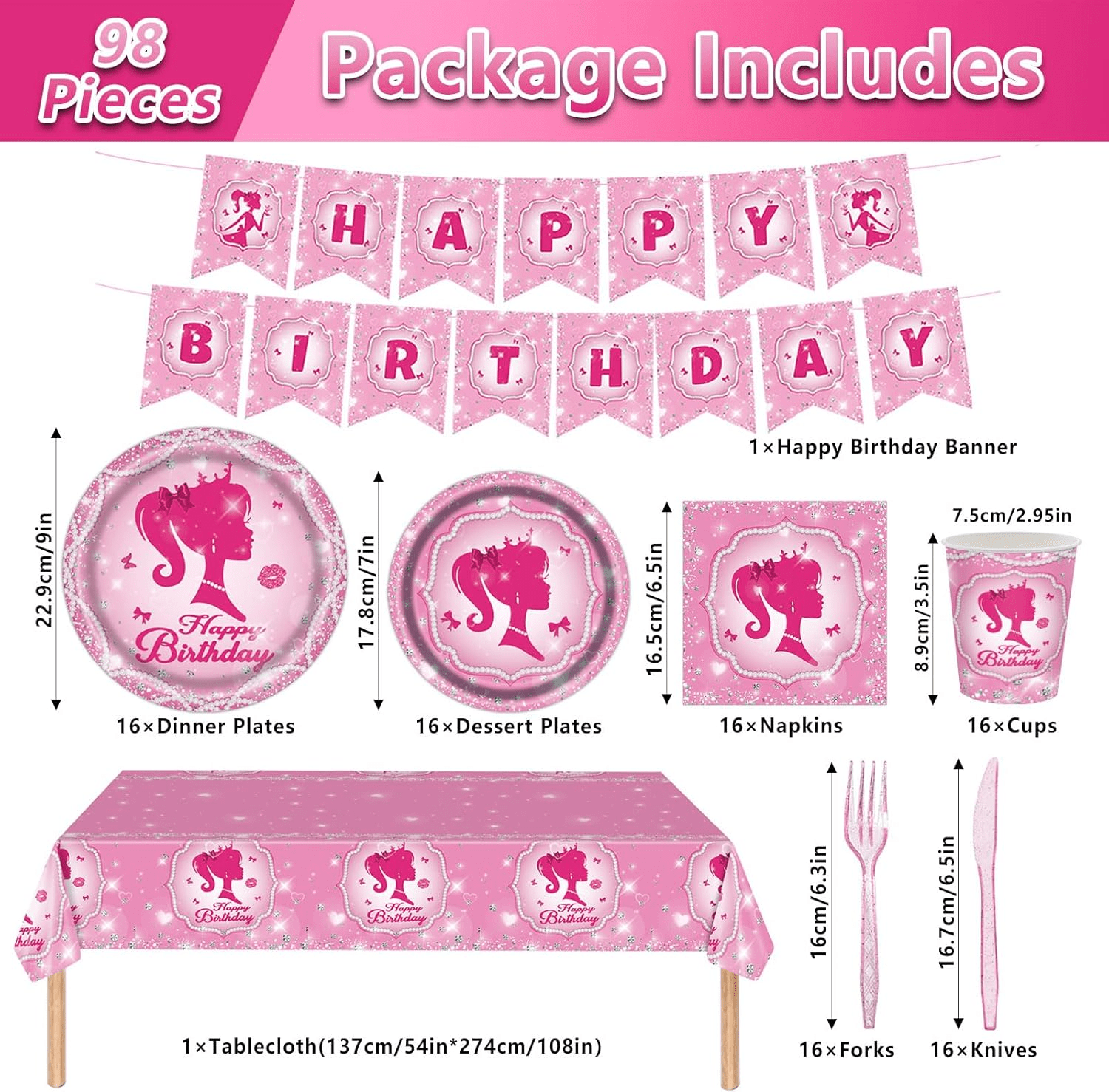 - Pink Girl Birthday Party Supplies Serve 16: Our pink girl birthday party tableware set comes with 98 pieces, including a pink girl theme “HAPPY BIRTHDAY” banner, a tablecloth (54″ x 108″), 16pcs pink girl dinner plates (9 inches), 16pcs pink girl dessert plates (7 inches), 16pcs napkins, 16pcs cups, 16pcs knives and 16pcs forks. Pink princess birthday party supplies can add more fun to the party and let your friends and family have a great time at a pink theme birthday party.
