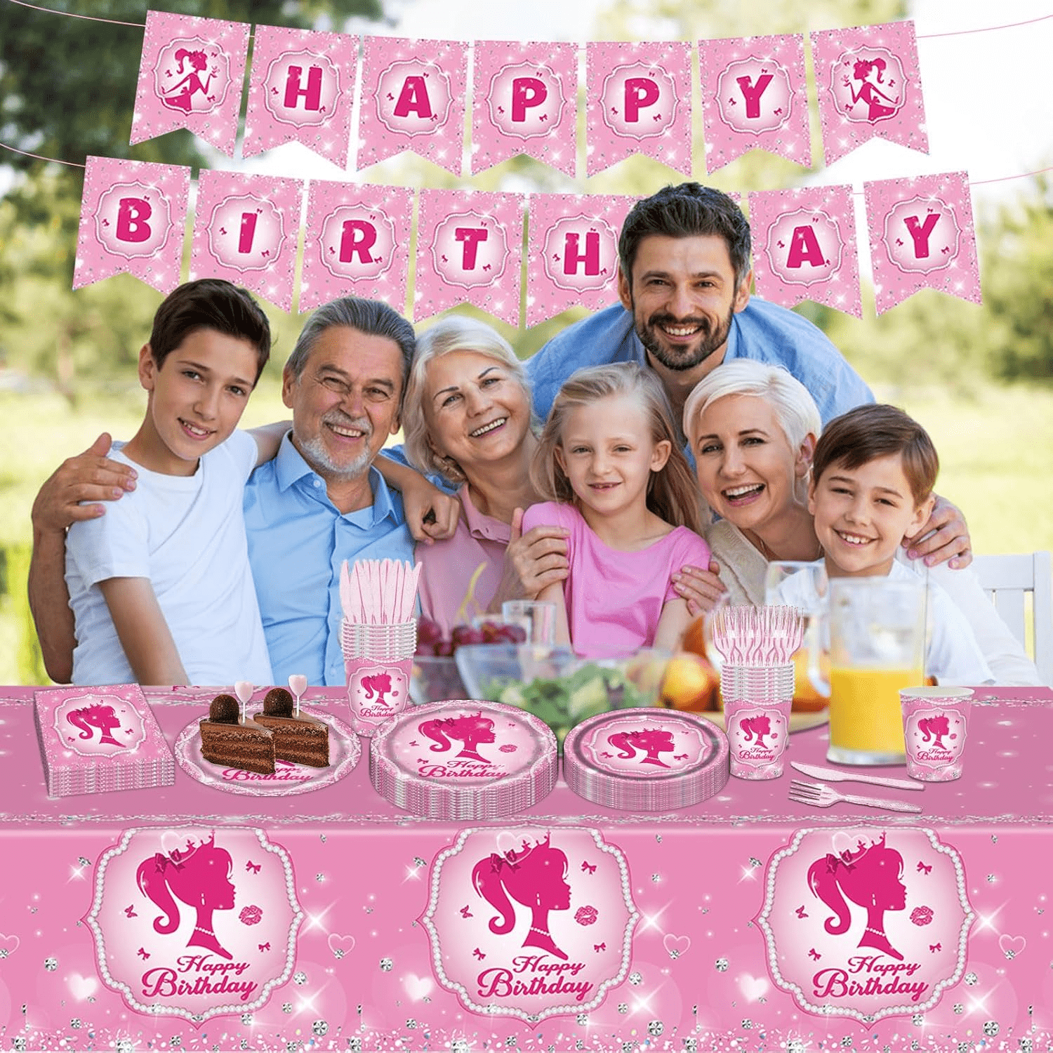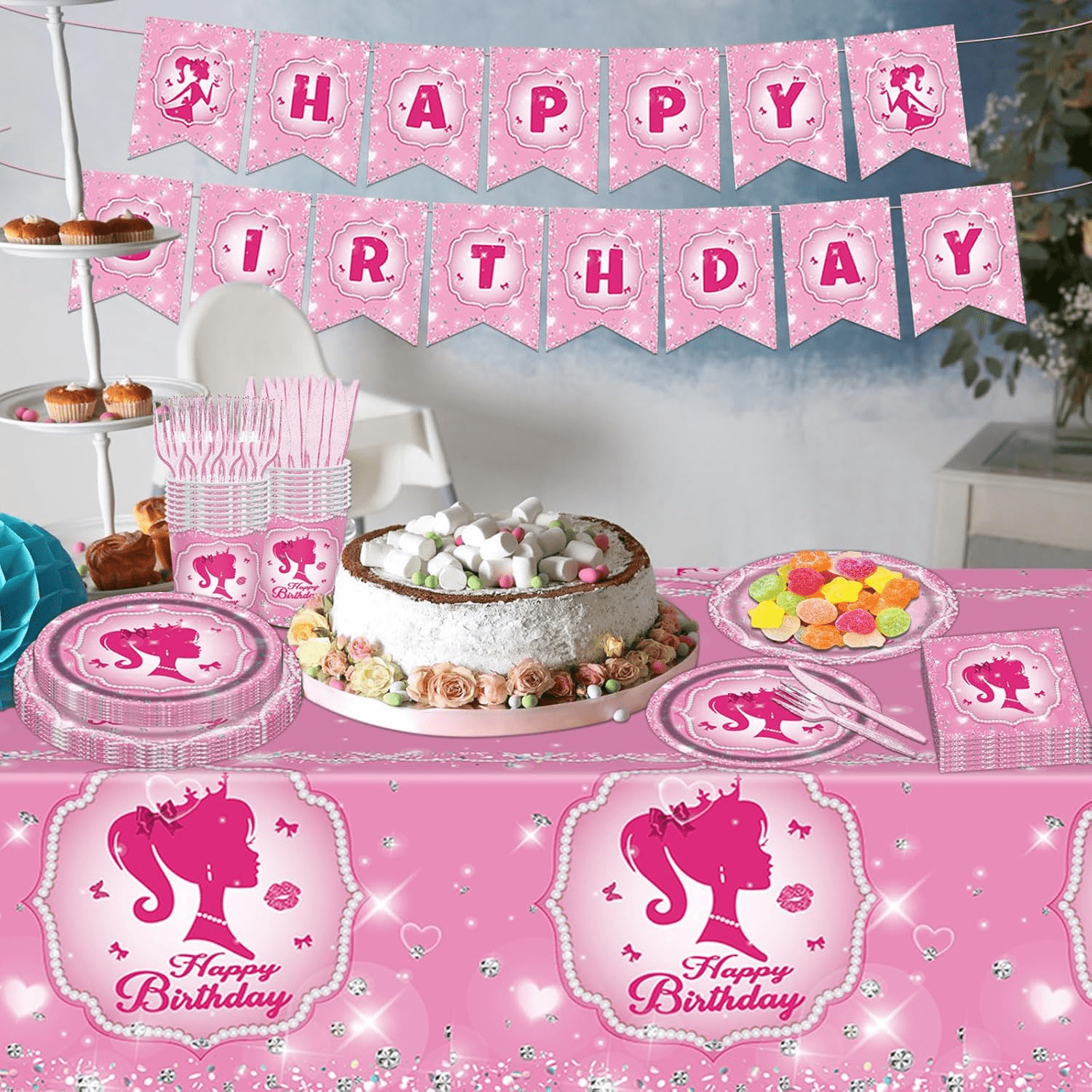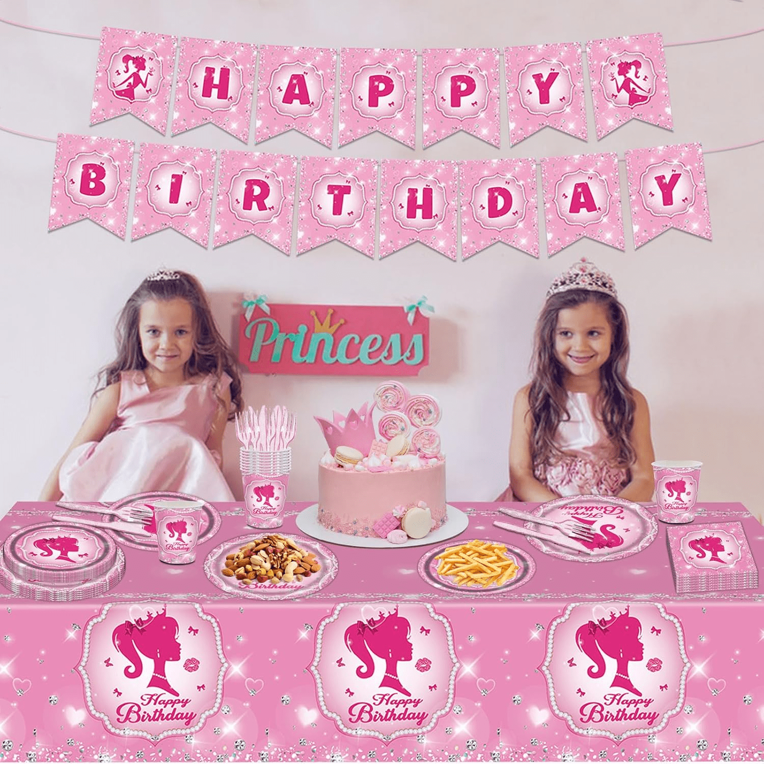 - Pink Girl Birthday Party Supplies Serve 16: Our pink girl birthday party tableware set comes with 98 pieces, including a pink girl theme “HAPPY BIRTHDAY” banner, a tablecloth (54″ x 108″), 16pcs pink girl dinner plates (9 inches), 16pcs pink girl dessert plates (7 inches), 16pcs napkins, 16pcs cups, 16pcs knives and 16pcs forks. Pink princess birthday party supplies can add more fun to the party and let your friends and family have a great time at a pink theme birthday party.