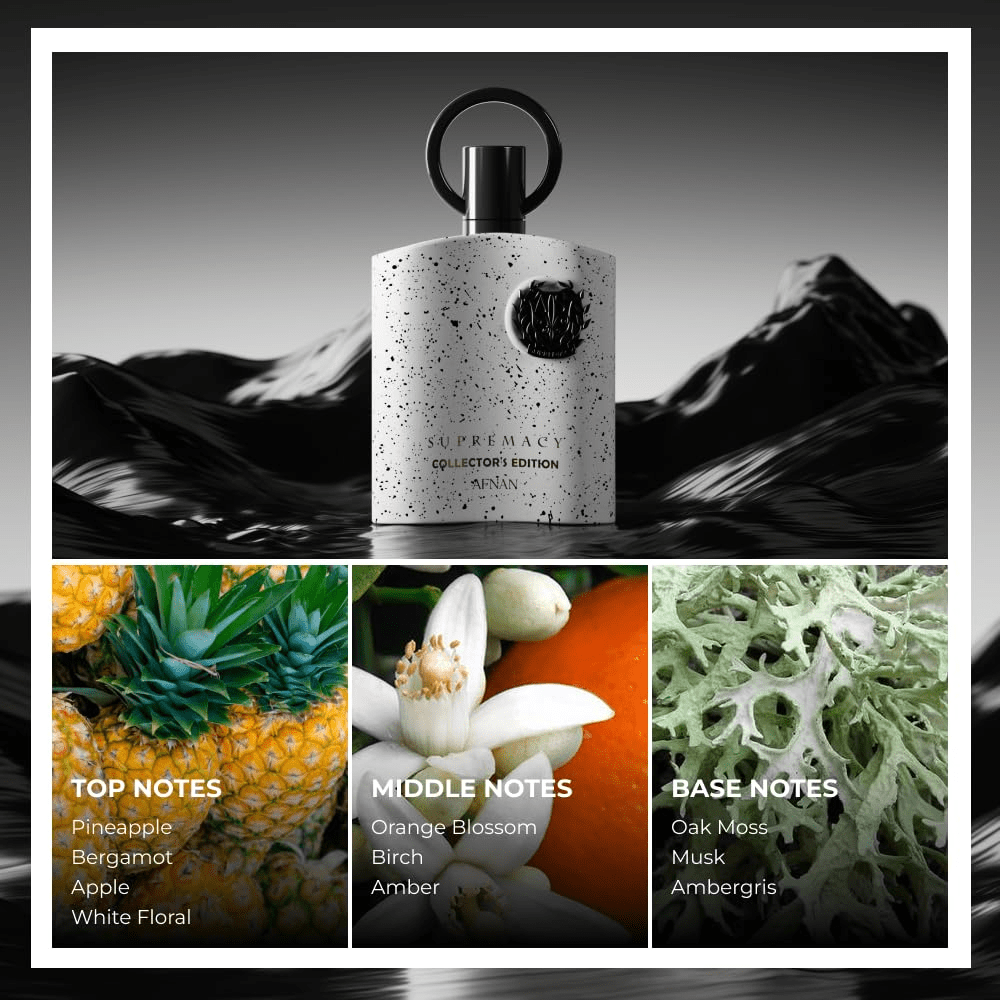 With its refreshing opening dominated by vibrant top notes of pineapple and bergamot, followed by the captivating heart notes of orange blossom, birch, and amber, this fragrance gradually settles into a warm, rich base of oak moss, musk, and ambergris. The Afnan Supremacy Collector’s Edition ensures that you stand out in any setting, making it a perfect addition to your fragrance collection.
