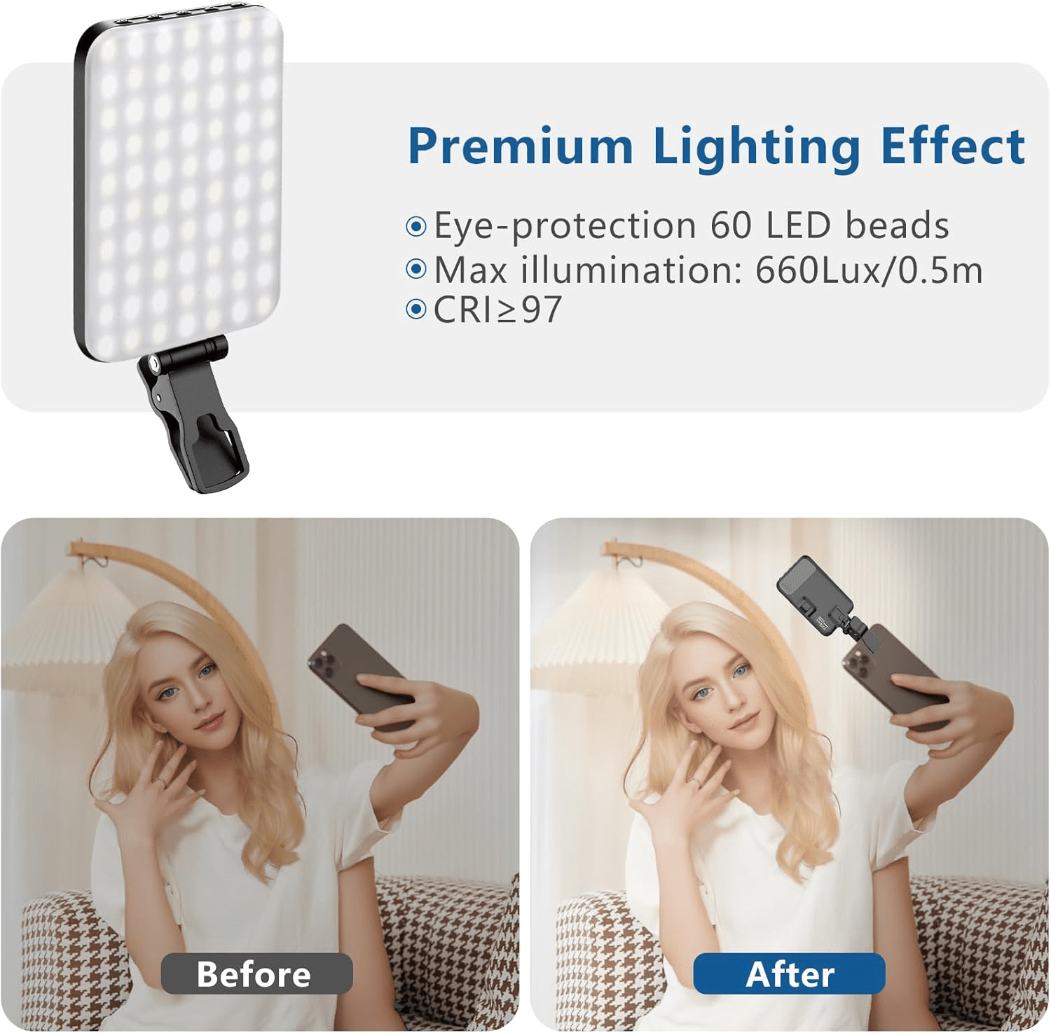 ALTSON 60 LED Portable Selfie Light Video Conference Lighting with Clip & Camera Tripod Adapter Rechargeable 2200Mah CRI 97+, 3 Light Modes for Phone Iphone Webcam Laptop Photo Makeup
