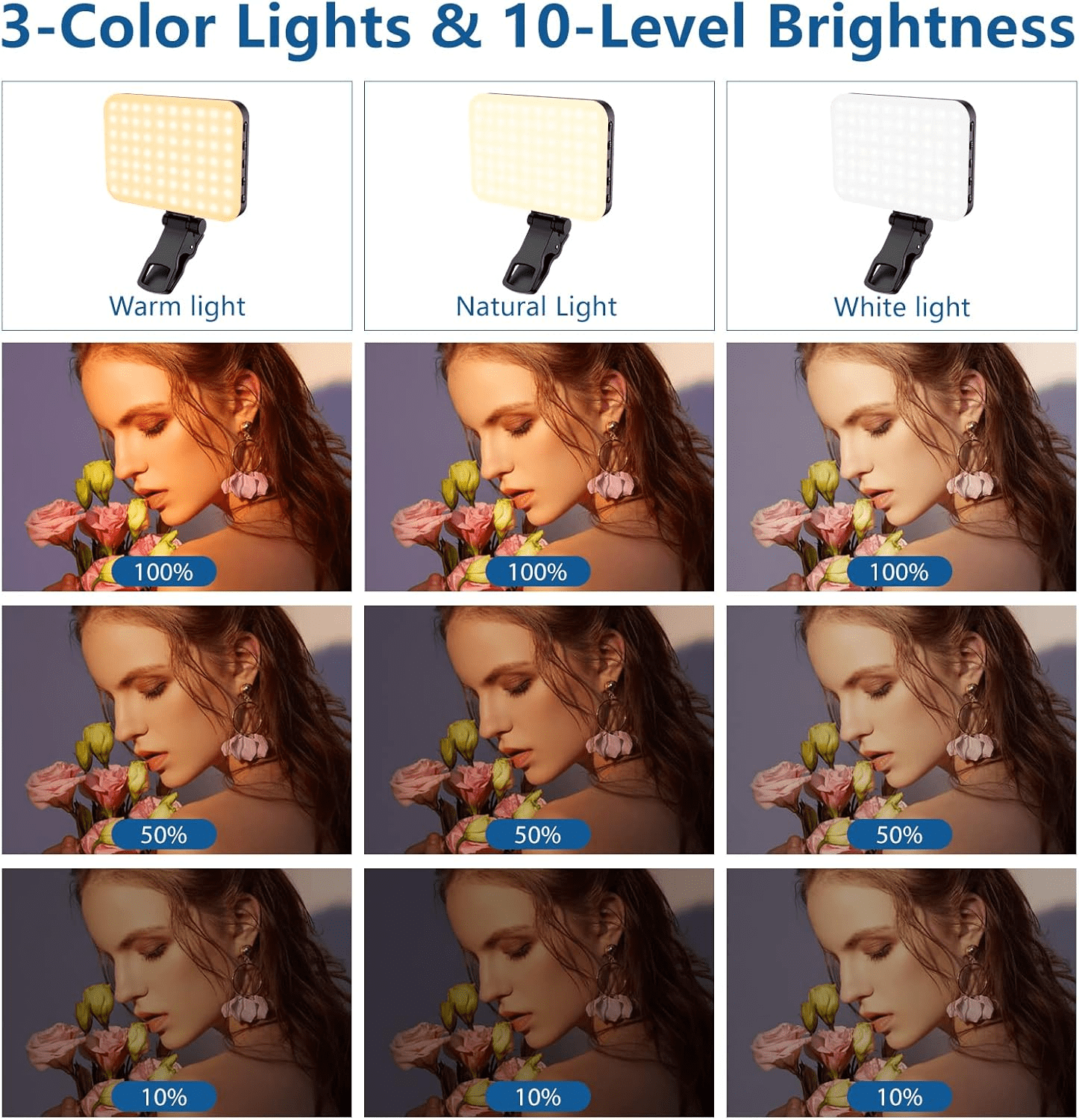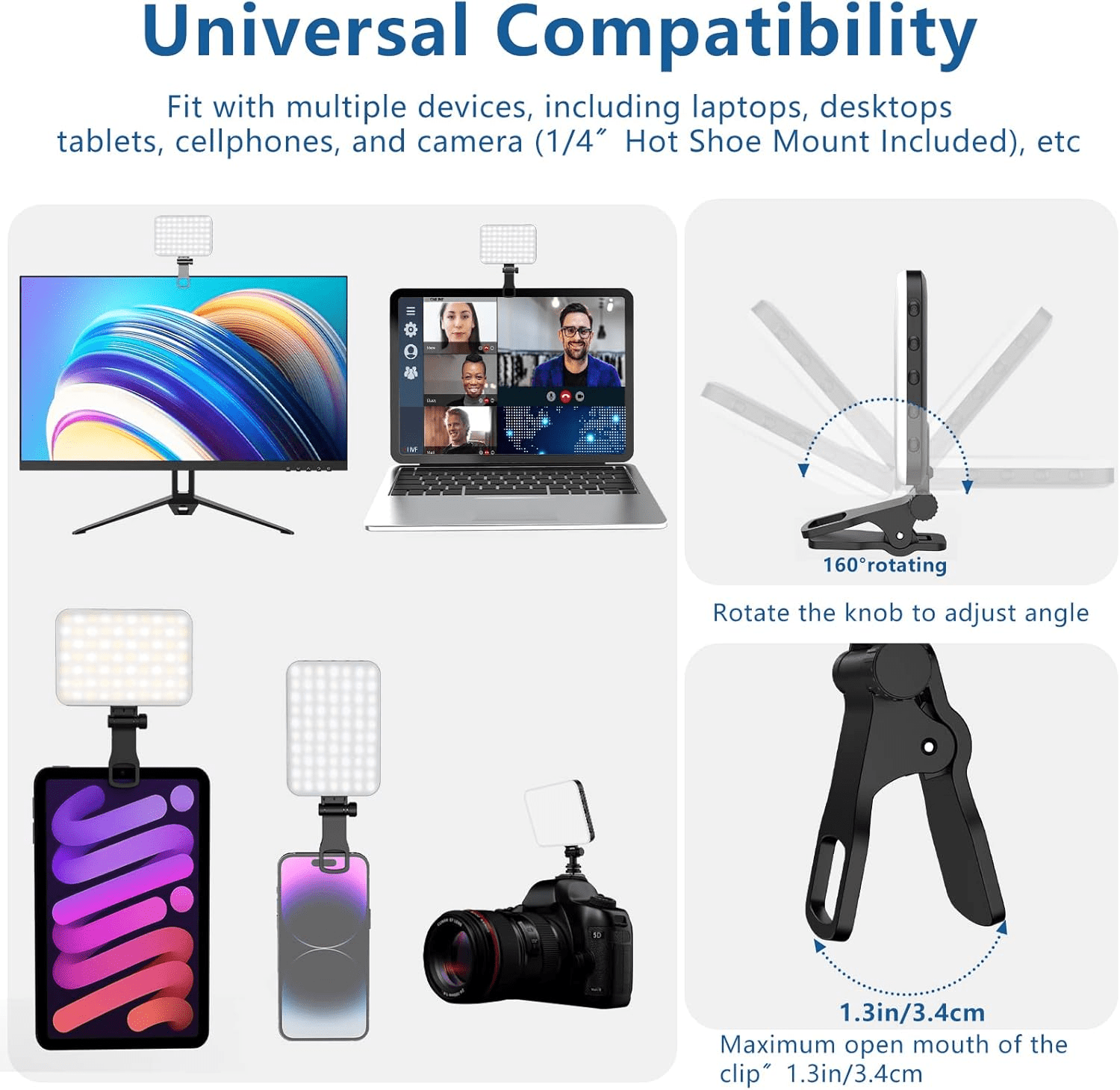 • Featuring three adjustable light modes—White, Natural, and Warm—and a color temperature range of 2500K to 6500K, this light adapts seamlessly to various environments and lighting conditions. The built-in 60 LED beads offer 10 levels of brightness for ultimate customization. Its compatibility with phones, tablets, laptops, and cameras makes it an outstanding choice for content creators. The 160° rotation adjustment and portable size allow for precise lighting placement in any setting, whether at home or on the go.