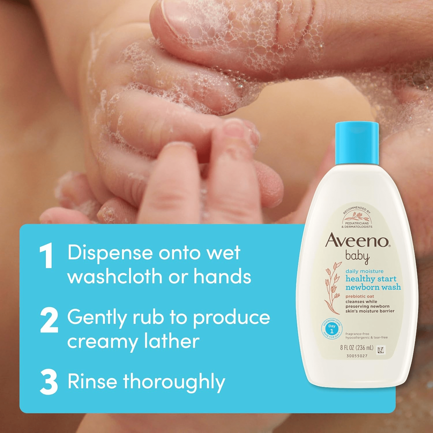 - The Aveeno Baby Healthy Start Nourishing Newborn Wash is an ideal body wash specifically designed for your little one’s sensitive skin. This 8-fluid ounce bottle contains prebiotic oat, which gently cleanses while preserving the moisture barrier essential for delicate newborn skin care. Suitable for use from day one, this body wash offers a safe and effective solution for your baby’s cleansing routine.