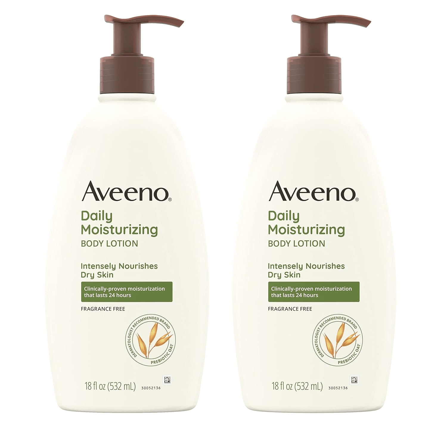 Aveeno Daily Moisturizing Body Lotion with prebiotic oat intensely nourishes dry skin. Formulated with a soothing prebiotic oat, this hydrating body lotion delivers clinically proven moisturization that lasts 24 hours. This daily body lotion for dry skin nourishes and helps replenish skin’s natural moisture barrier. The unique prebiotic oat formula absorbs quickly and nourishes dry skin with moisture, leaving your skin soft, beautiful and healthy-looking all day. Aveeno Daily Moisturizing Lotion is a non-comedogenic moisturizer with a gentle formula that is fragrance, paraben and dye free. From the dermatologist-recommended brand, this nourishing body moisturizer is allergy tested and non-greasy, non-comedogenic, and gentle enough for daily use as part of a regular skincare and beauty routine. To use, apply daily as often as needed.