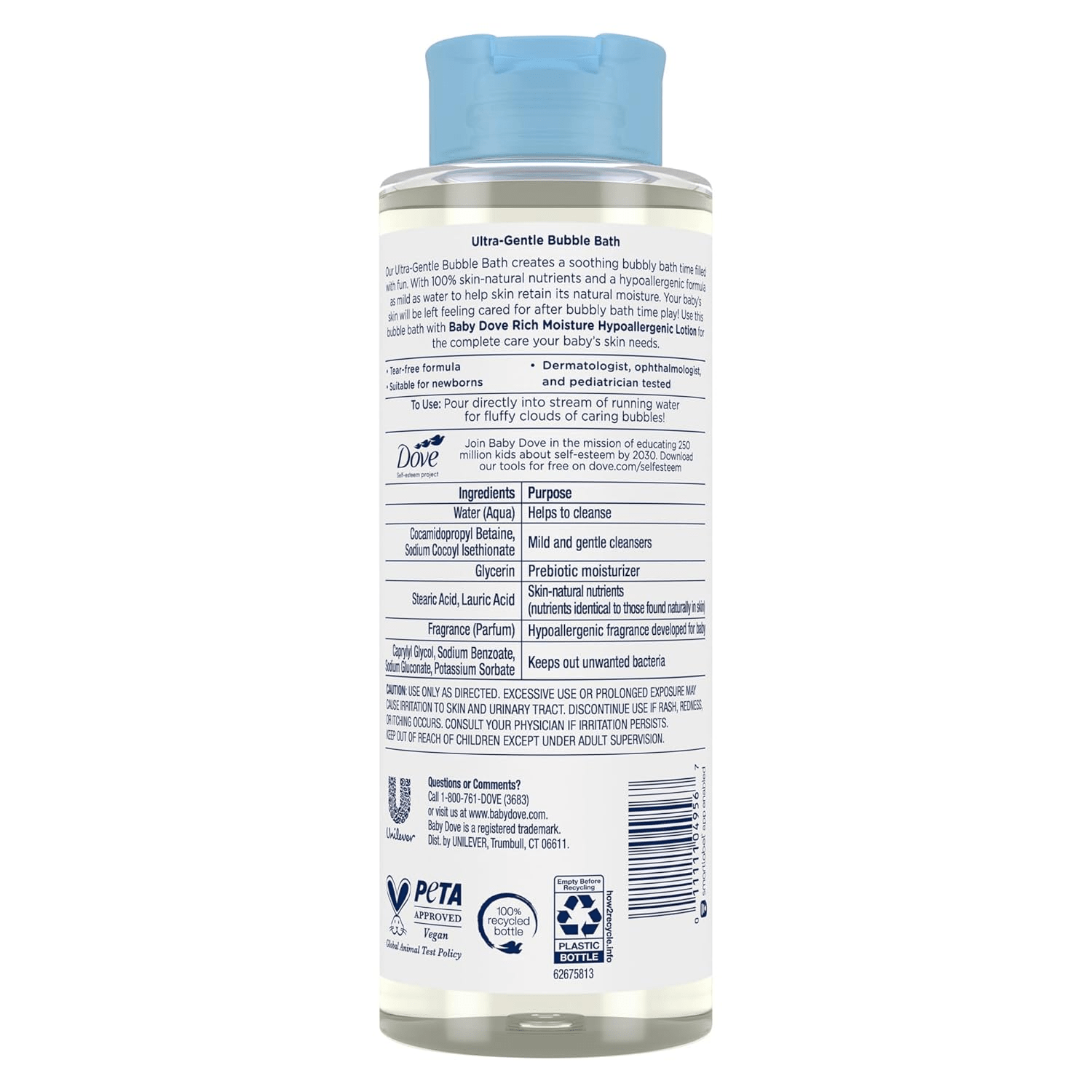• CARE THAT GOES FURTHER: Every Baby Dove Bubble Bath is packaged in a 100% recycled bottle, and Baby Dove is PETA approved, meaning we do not test on animals anywhere in the world.