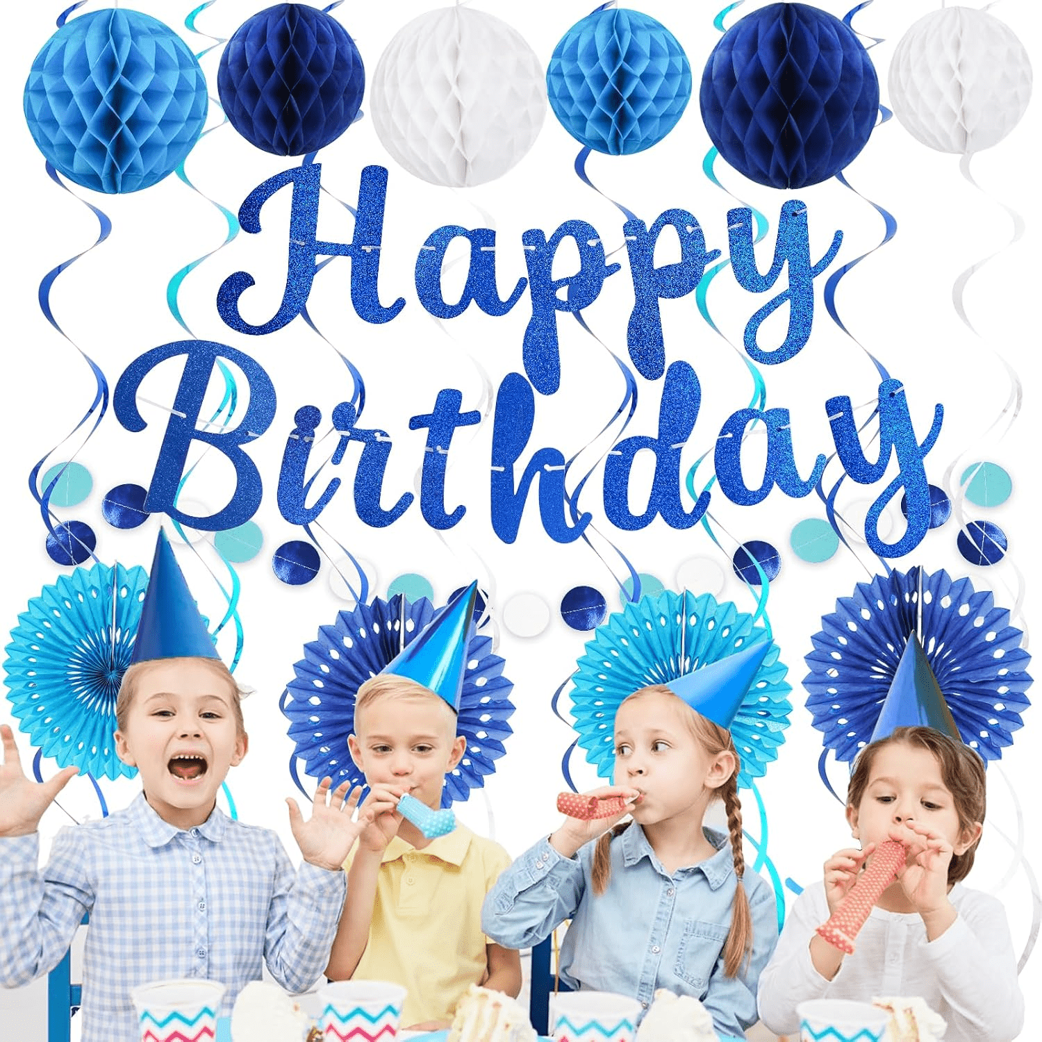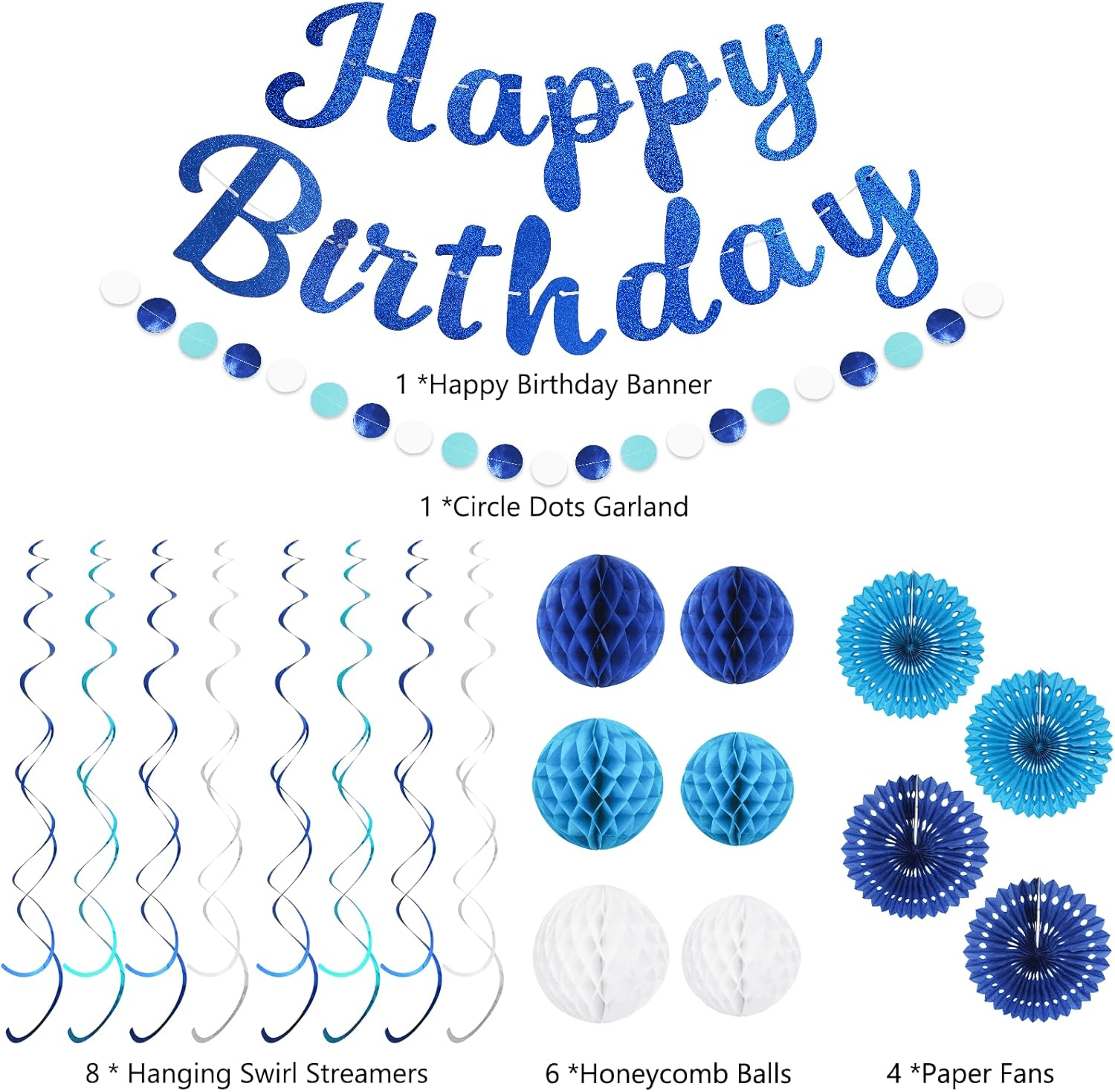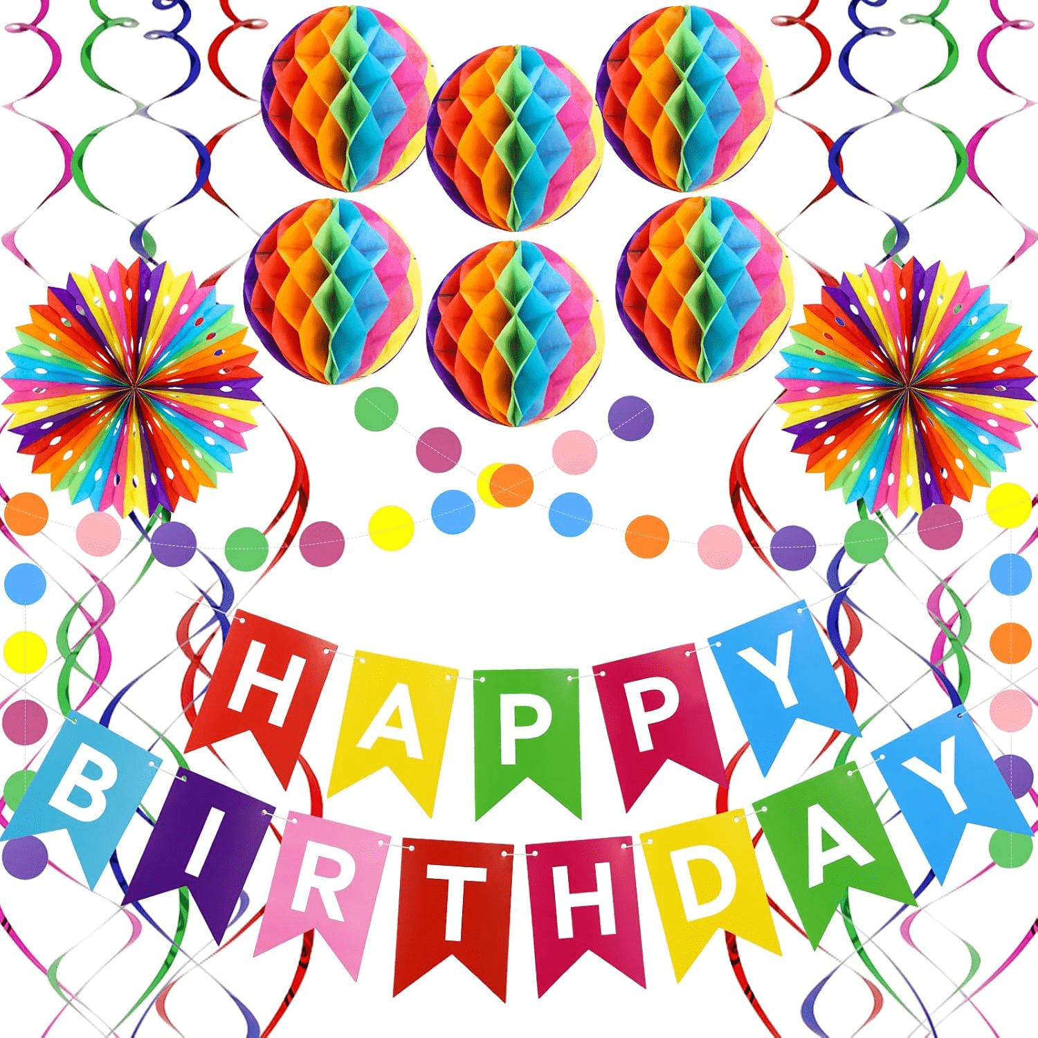 - 𝐏𝐀𝐂𝐊𝐀𝐆𝐈𝐍𝐆 𝐋𝐈𝐒𝐓 – 1 x Pre-Strung happy birthday banner, 1 x circle dot garland, 6 x honeycomb balls, 4 x paper fans, 8 x hanging swirls streamers.