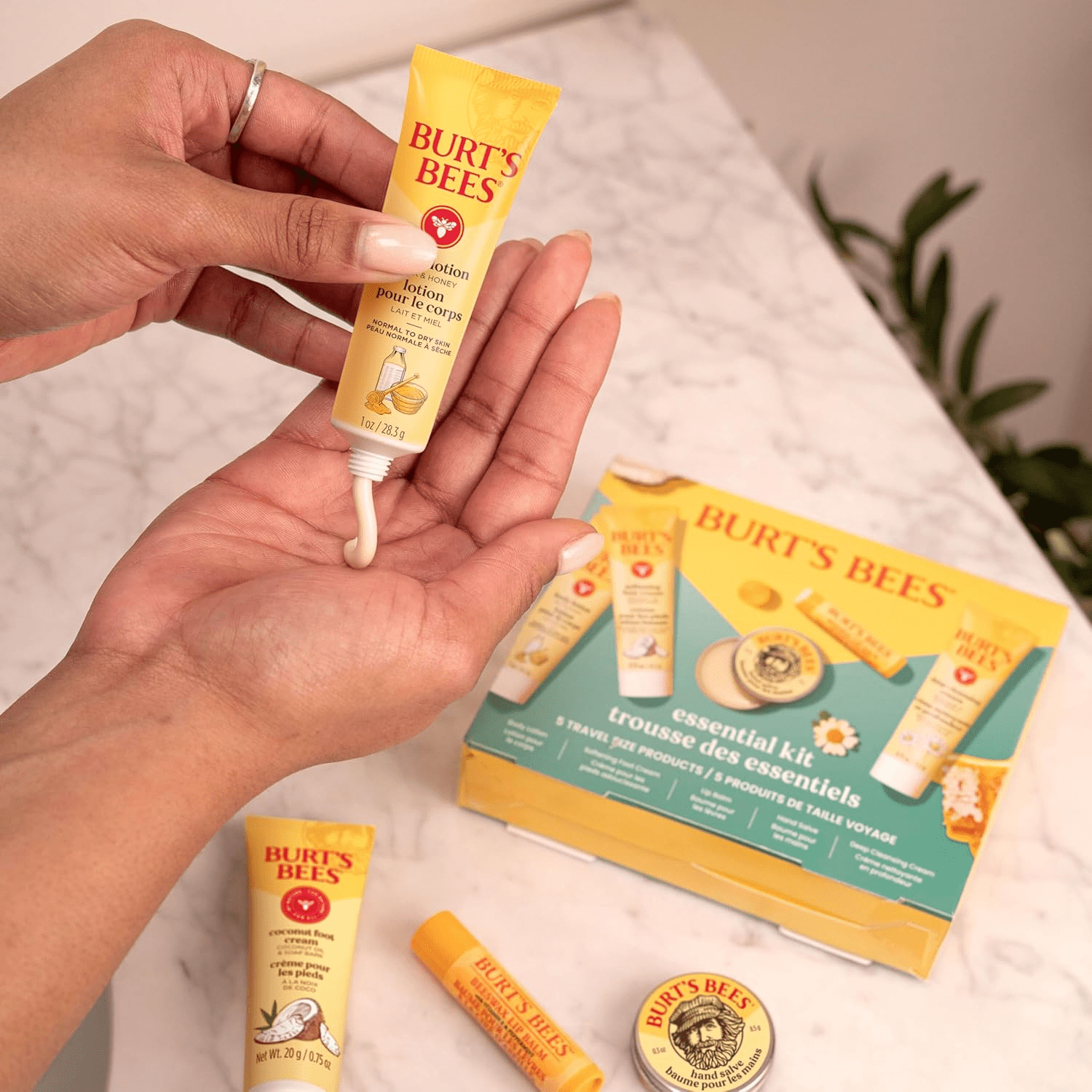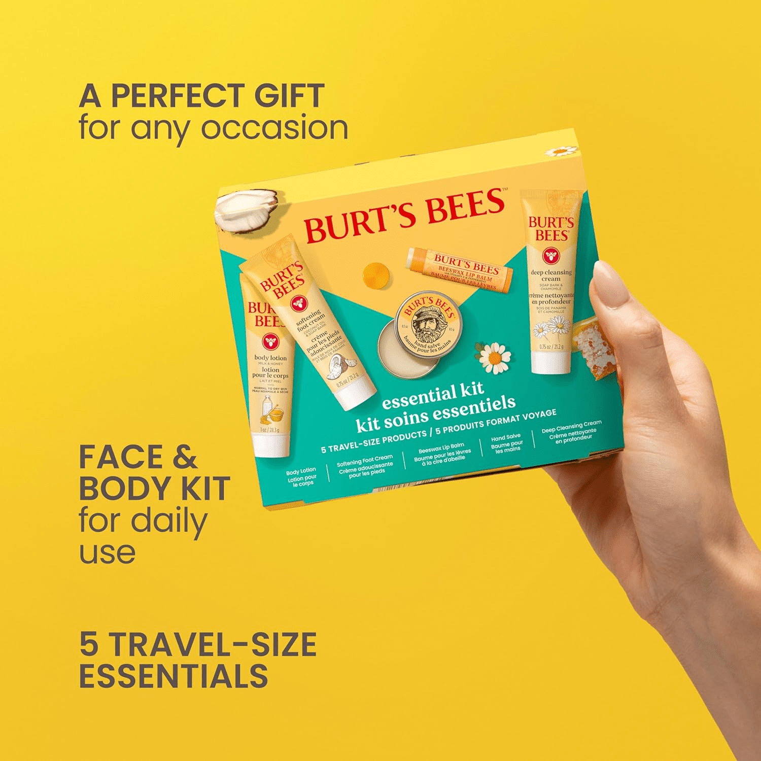 - GIFT SET: One Burt’s Bees Essential Kit that includes five travel size skin care products, including Deep Cleansing Cream, Softening Foot Cream, Milk and Honey Body Lotion, Hand Salve and Beeswax Lip Balm