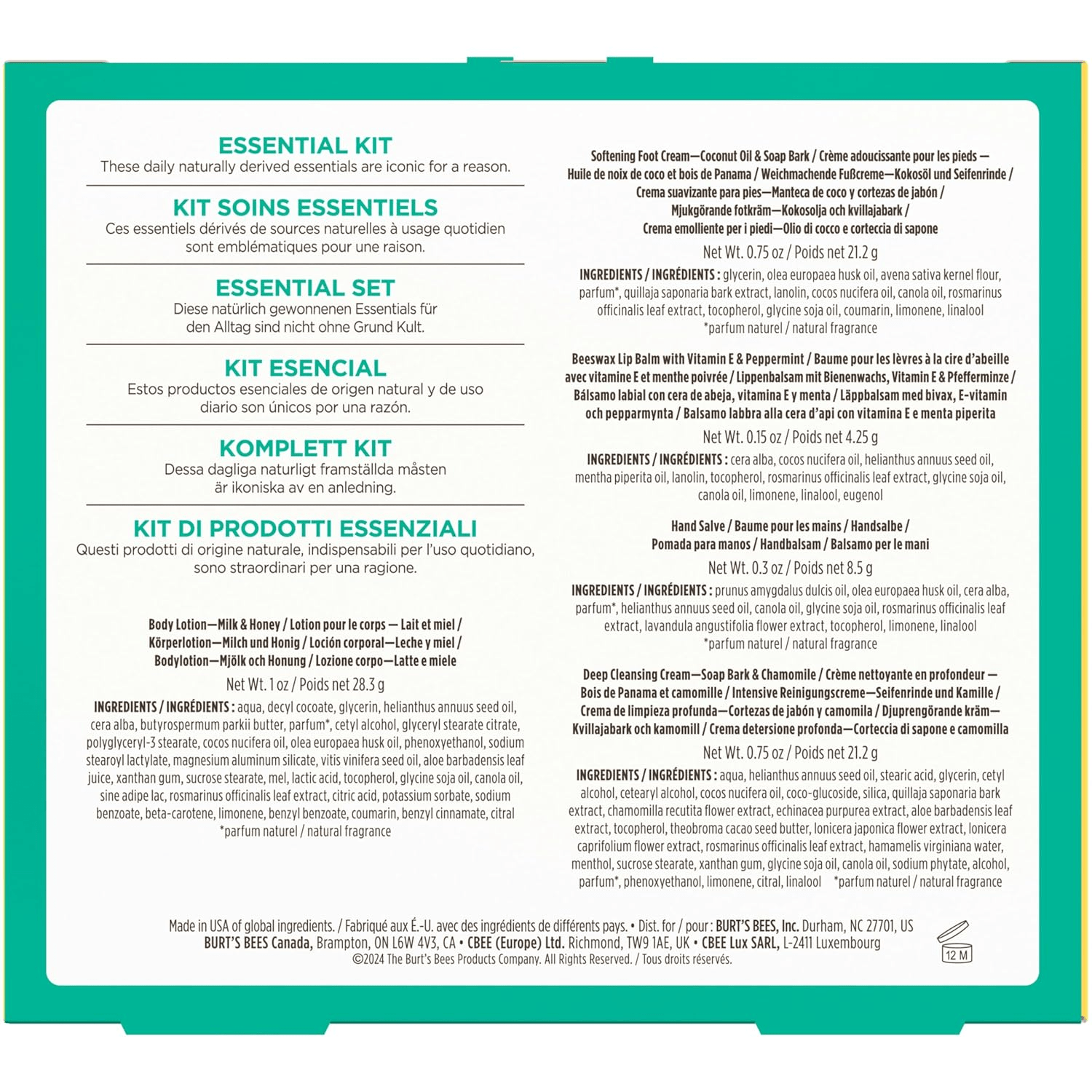 - ESSENTIAL KIT: Each kit contains one 0.75 oz. Softening Foot Cream, one 1 oz. Milk and Honey Body Lotion, one 0.3 oz. Hand Salve, one 0.75 oz. Deep Cleansing Cream and 0.15 oz. Beeswax Lip Balm