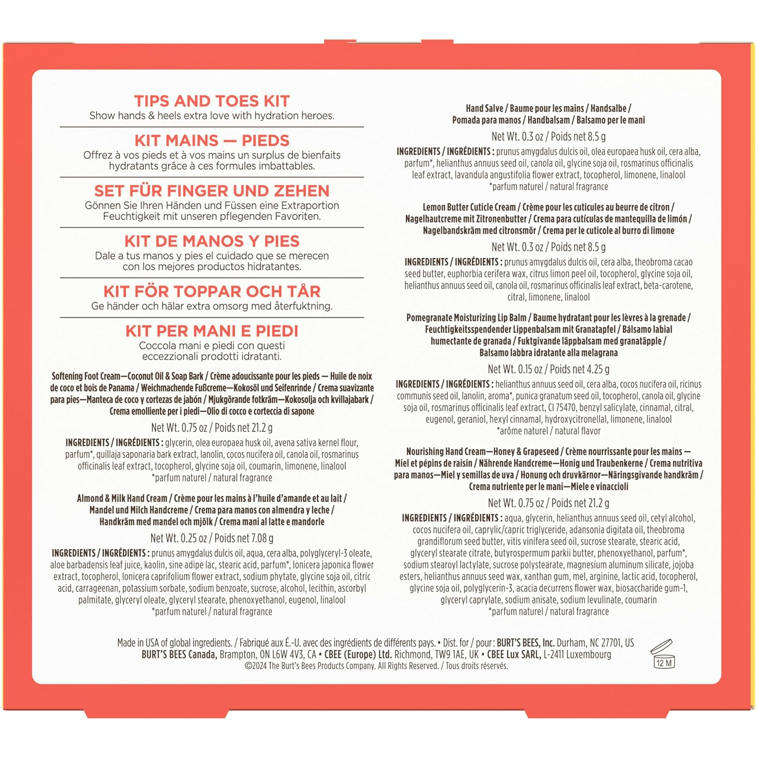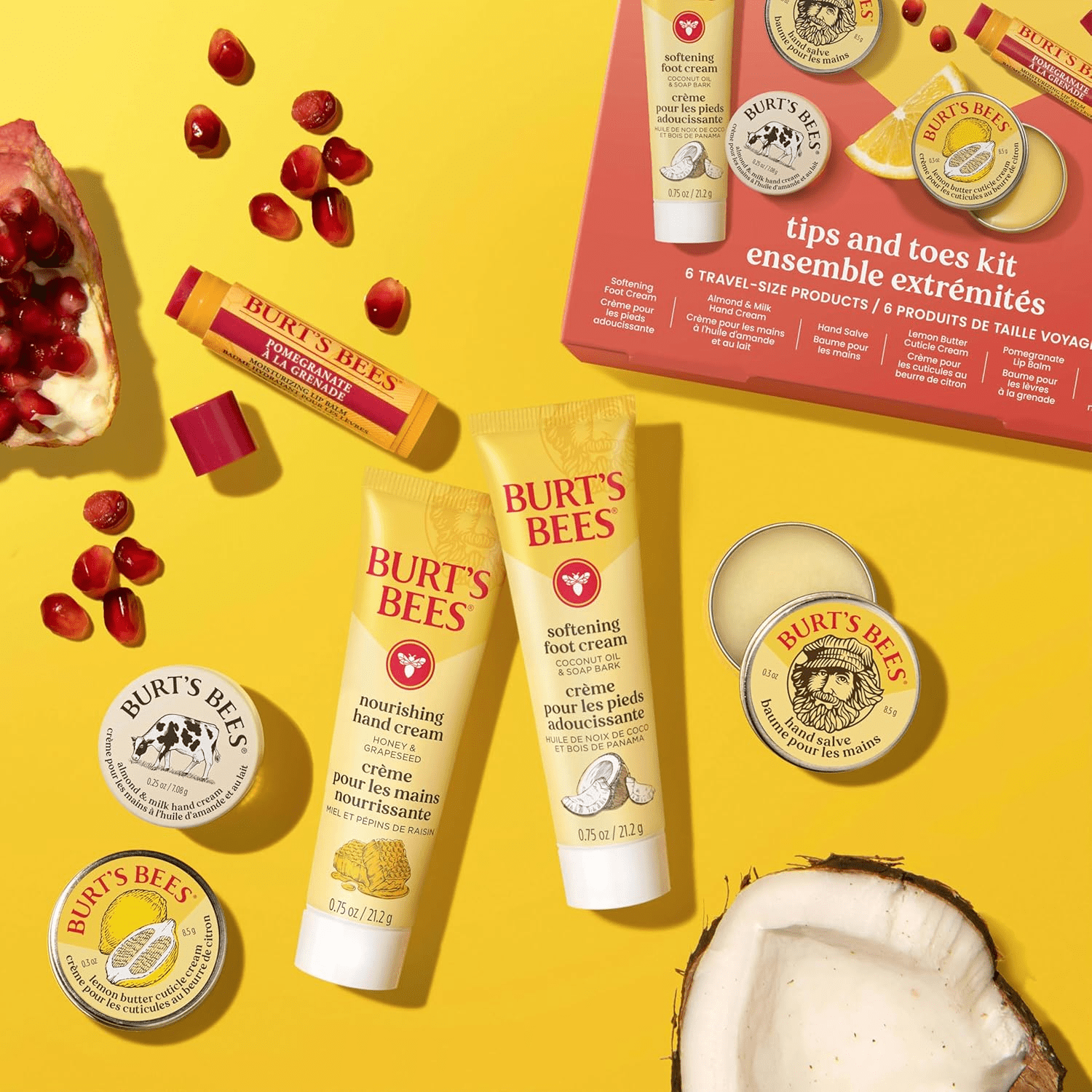 - GIFT SET: One Burt’s Bees Tips and Toes Kit that includes six travel size skin care products, including foot cream, two varieties of hand cream, hand salve, cuticle cream and lip balm