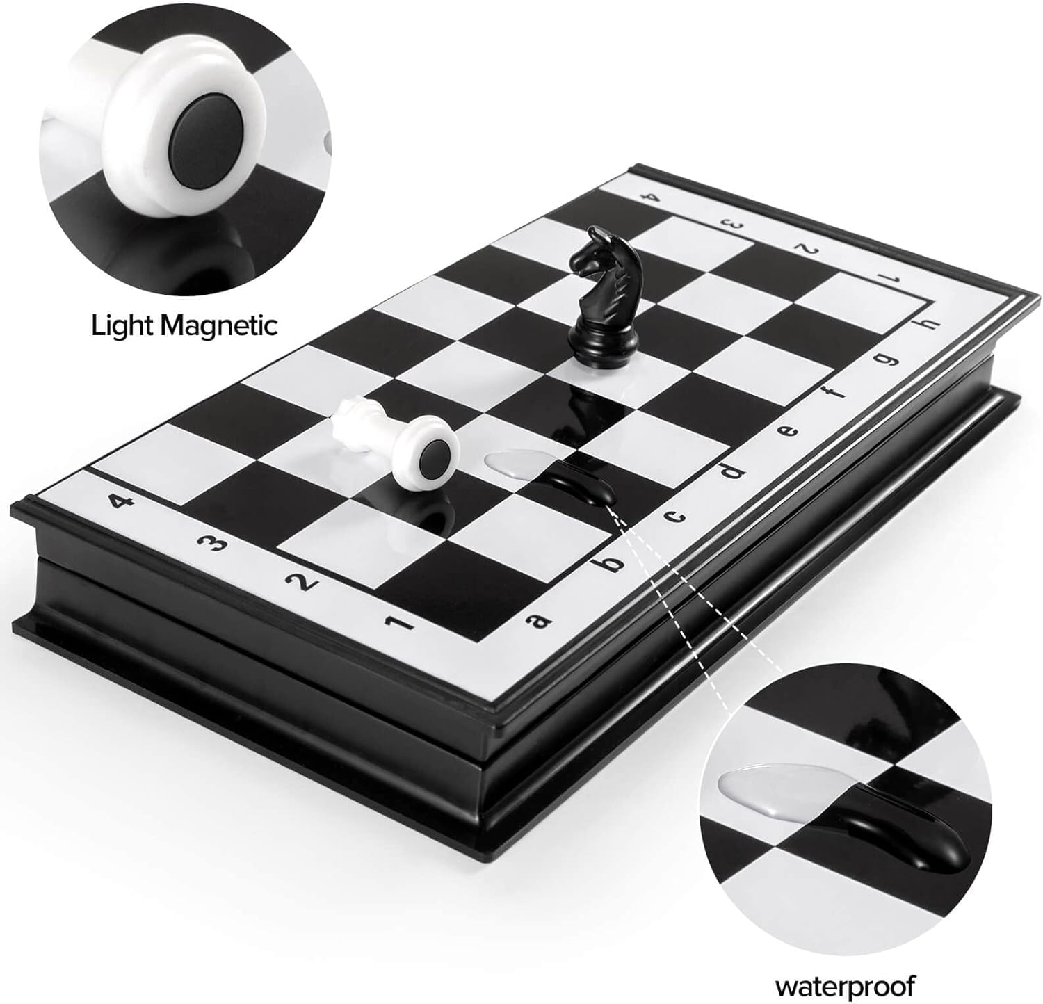 - PORTABLE TRAVEL SIZE – Designed with convenience in mind, this foldable chess set features dimensions that make it easy to transport. When not in use, all pieces can be stored within the board itself, which can be safely and easily closed and stored. The open board measures 9.45″ x 9.45″ x 0.69″, while the closed size is compact at 9.61″ x 4.81″ x 1.34″. This chess set is the perfect companion for family games, competitive play at school, or quality time during travel.