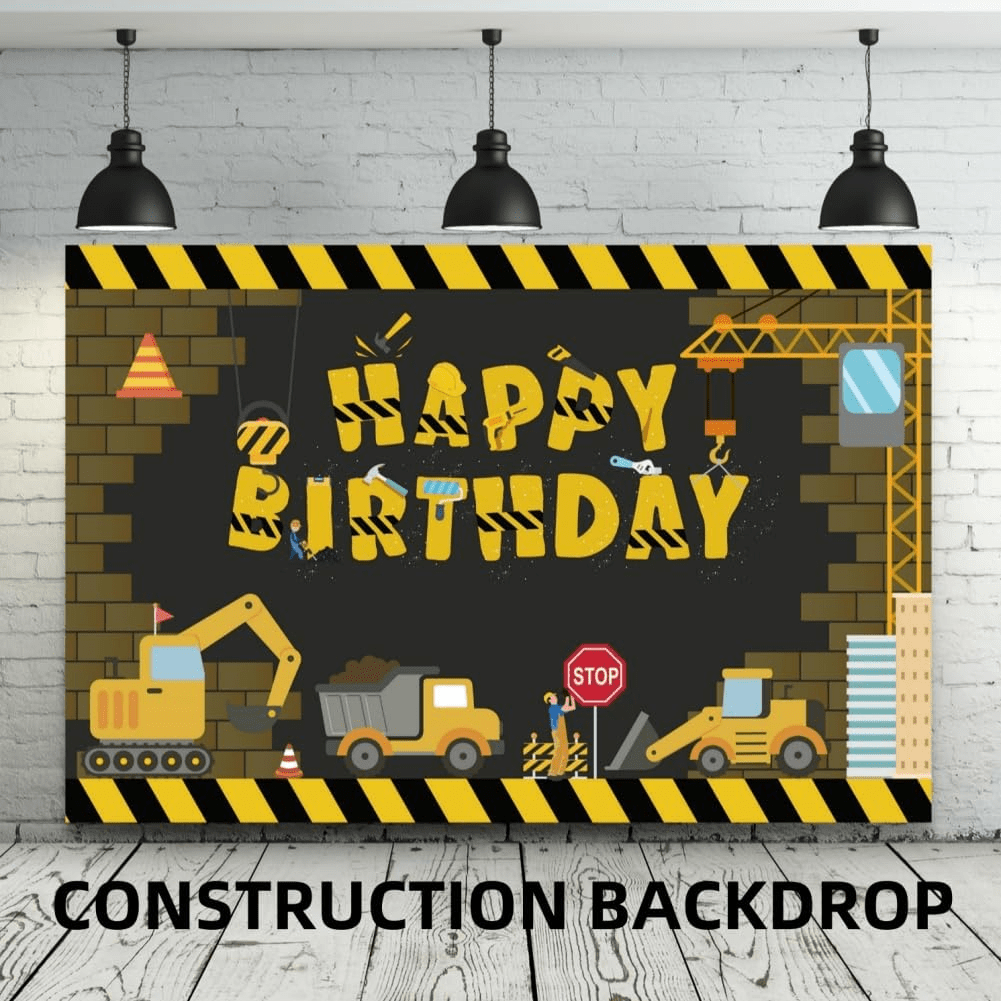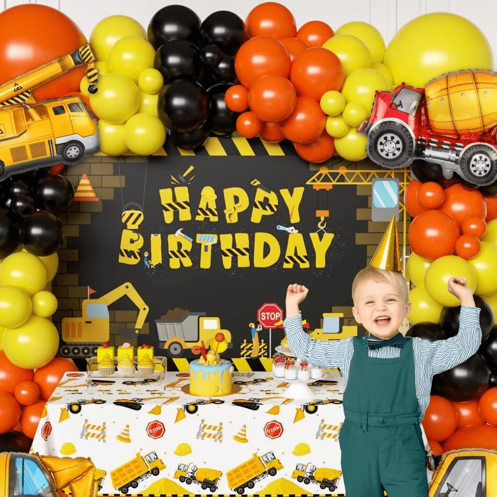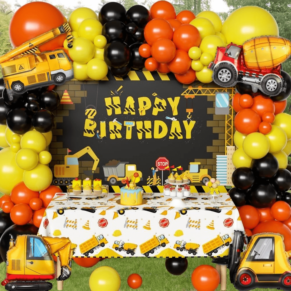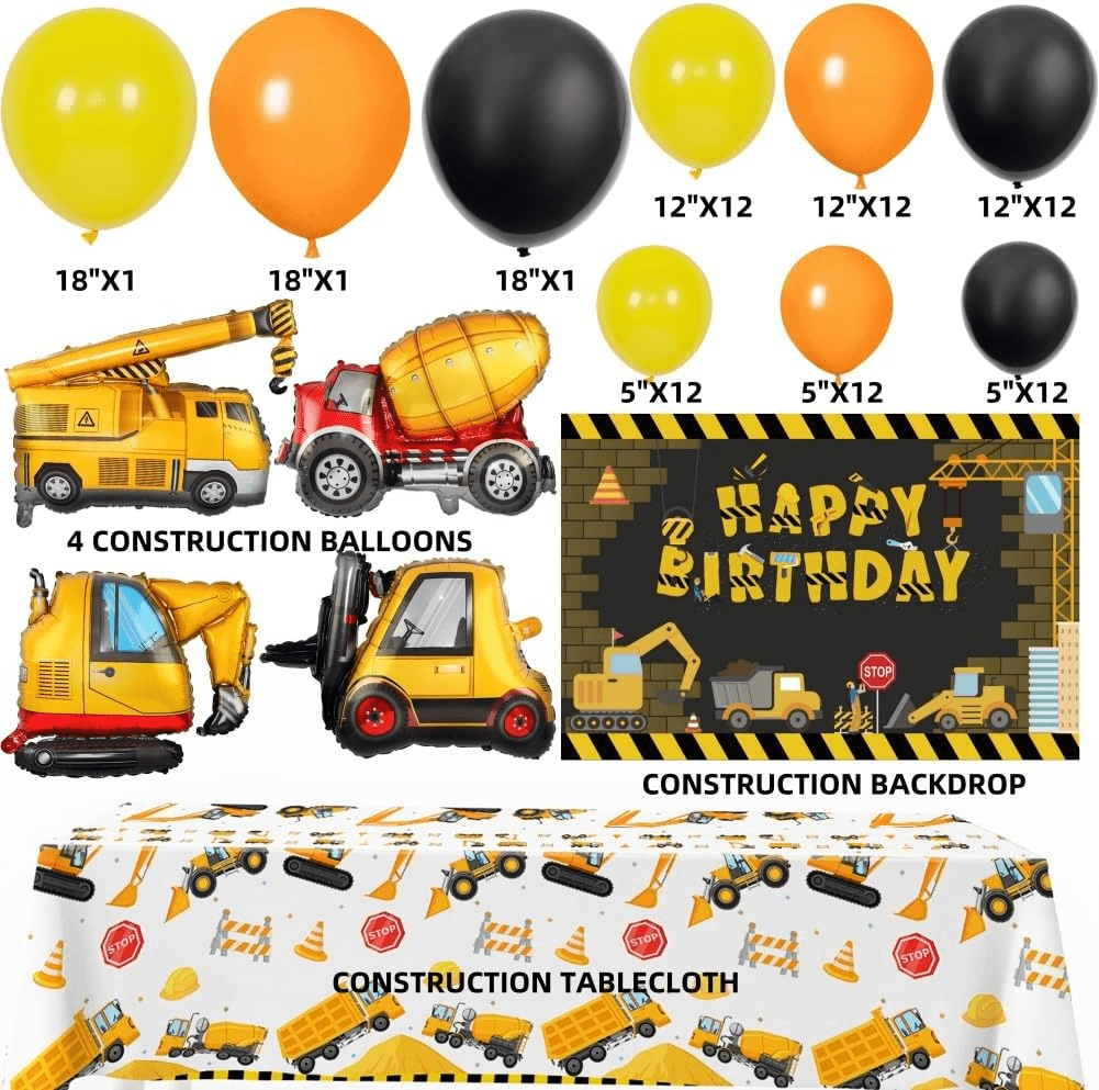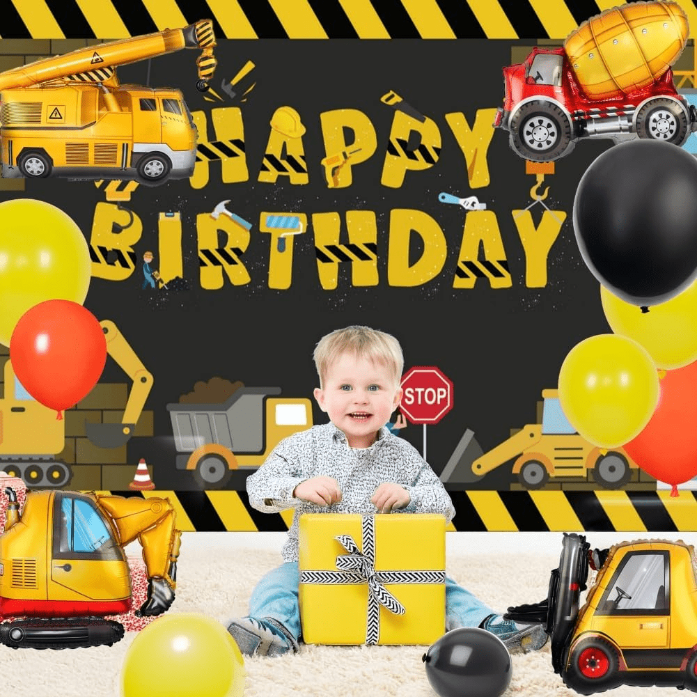 - PACKAGE INCLUDED: 1 pack construction happy birthday photo backdrop; 4 Pack Dump Truck foil balloons; 75pcs latex balloons ; 1pcs construction tablecloth, 1 roll balloon arch strip, all in the box