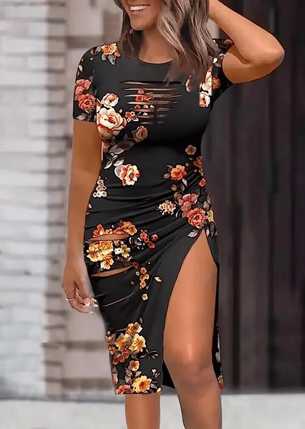 Women Sexy Cut Out Hollow Out Bodycon Dress Side Slit Drawstring Club Party Short Sleeve Midi Dresses