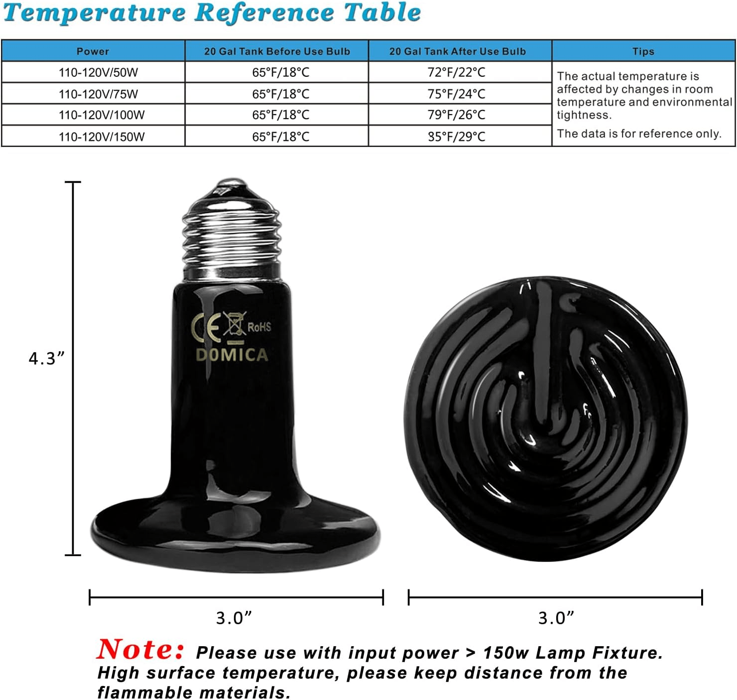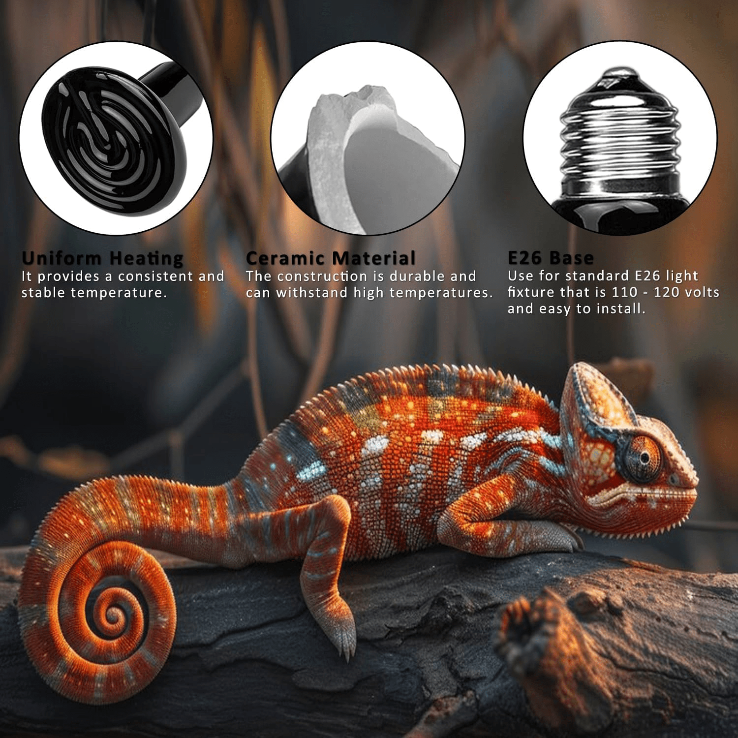 - The DOMICA 100W Reptile Heat Bulb is designed to create a stable and comfortable environment for your pets. Its ceramic heat emitter effectively warms living spaces for reptiles, amphibians, and birds, without emitting light that can disturb their natural cycles. This heat emitter works beautifully in tandem with daytime heat bulbs to provide warmth without interfering with nighttime rest. Whether used in a brooder for baby chicks or a habitat for bearded dragons, this bulb promotes the healthy sleep cycle necessary for the well-being of your pets.
