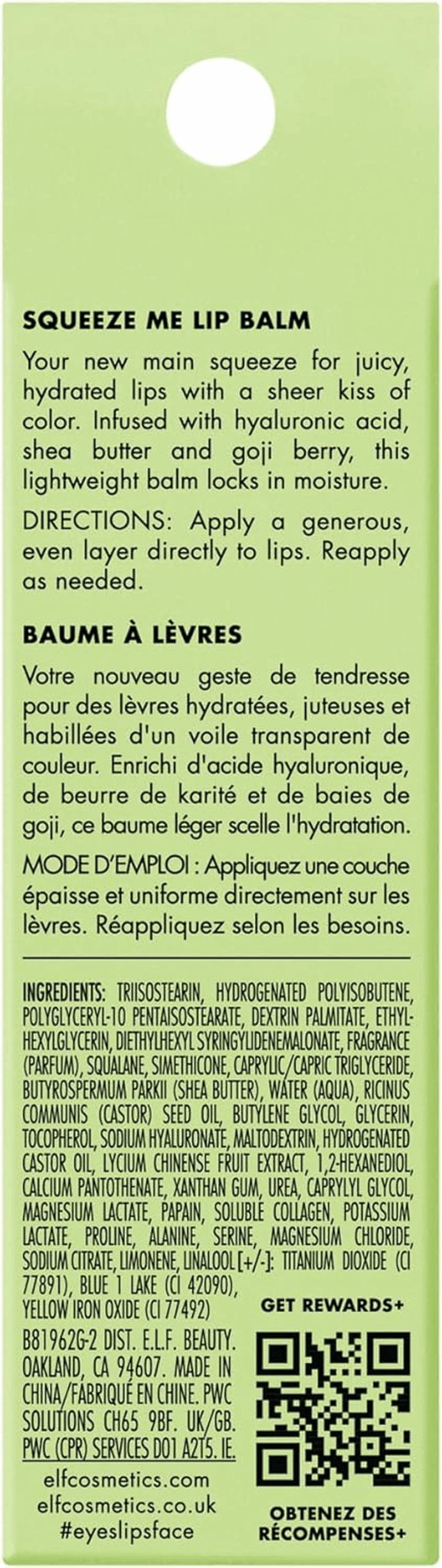 • MOISTURIZING LIP BALM: Introducing e.l.f. Cosmetics Squeeze Me Lip Balm, the ultimate solution for achieving beautifully hydrated and nourished lips. This product is perfect for those who seek both care and a touch of color in their daily beauty routine.