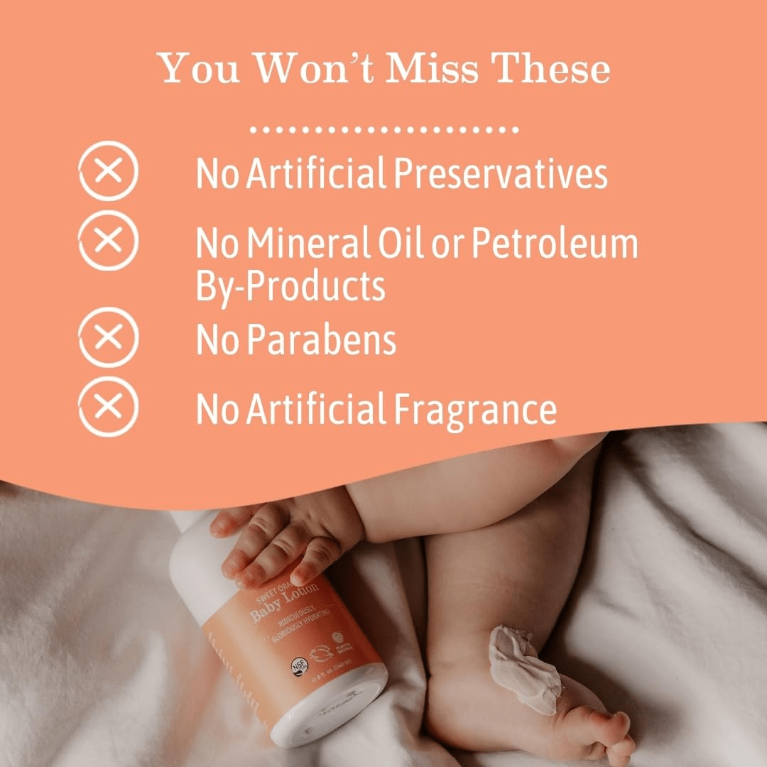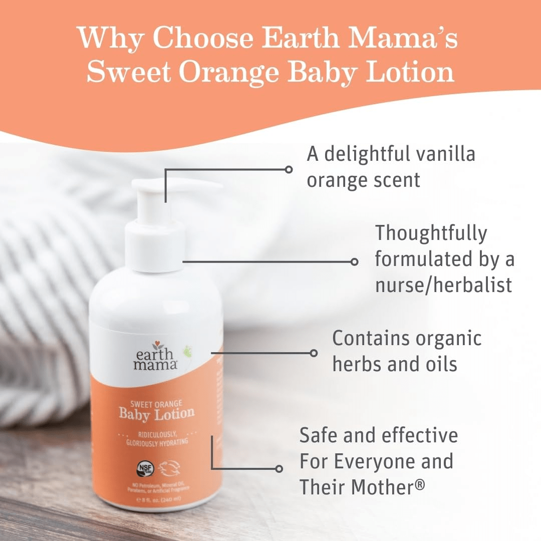 - Earth Mama Sweet Orange Baby Lotion is a luxurious, gentle body lotion specifically formulated for delicate skin. Enriched with organic oils, calendula, and rooibos, it provides exceptional moisture and soothing comfort. Ideal for newborns and children, this lotion is also suitable for adults, making it a versatile addition to your family’s skincare routine.