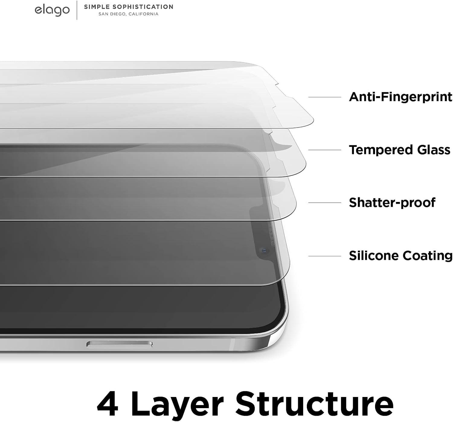 - The innovative four-layer design of the Elago screen protector provides comprehensive coverage against daily wear and tear. Featuring an anti-fingerprint layer to keep your screen smudge-free, a double protection layer for added resilience, a shatter-proof layer to prevent breakage, and a bubble-free layer for seamless application, this protector is engineered to keep your phone screen pristine in any environment.