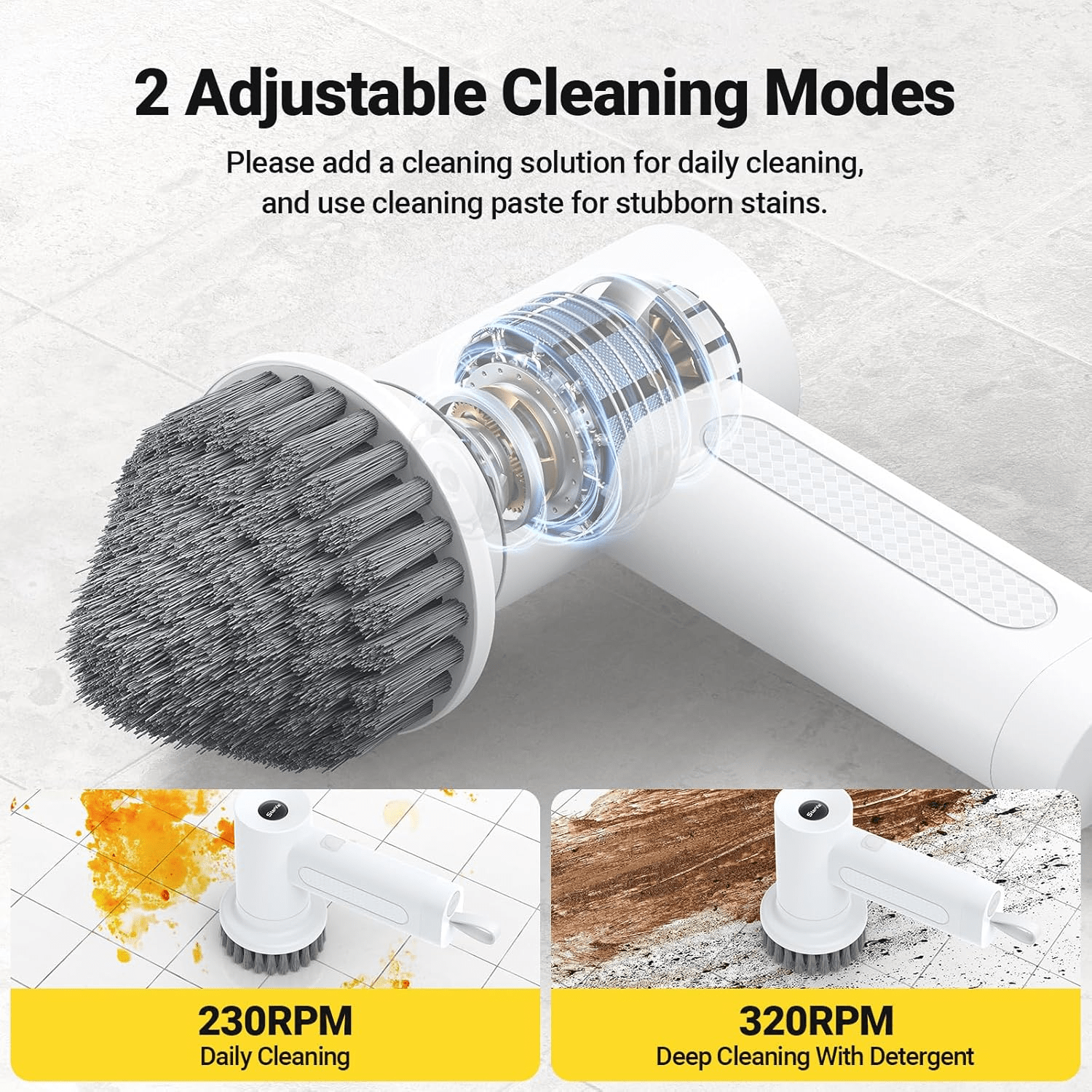 – Dual-speed operation (low: 230 RPM for regular cleaning, high: 320 RPM for deep cleaning)