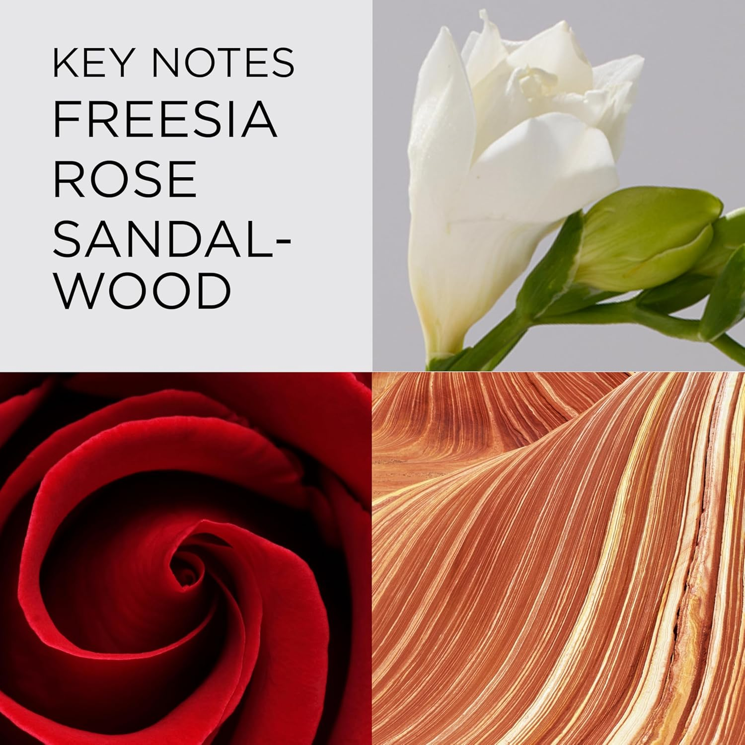 - Luxurious floral fragrance with notes of freesia, red roses, and sandalwood.