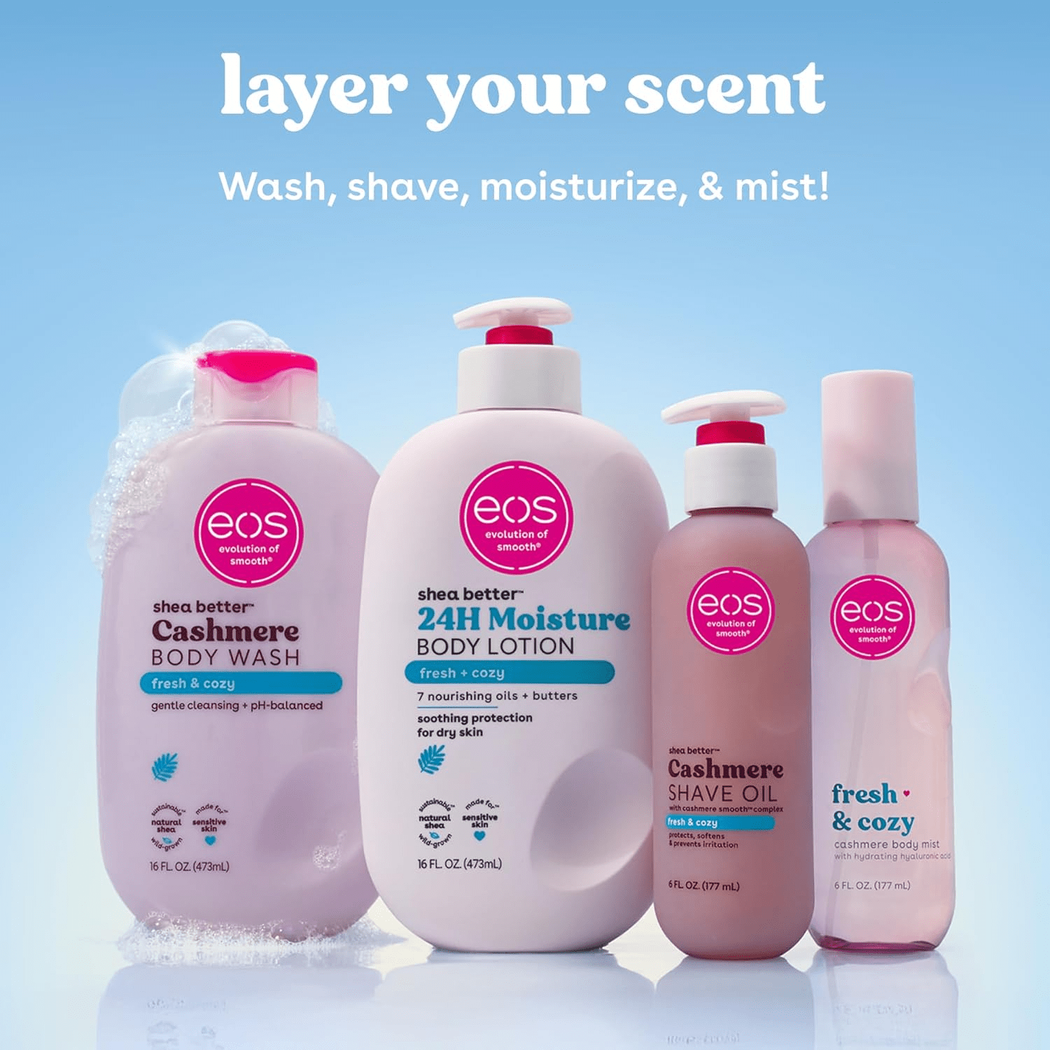 The eos Fresh & Cozy Cashmere Shave Oil not only promotes a flawless shave but also nourishes your skin for a cashmere-soft feel. With added benefits from jojoba seed oil and glycerin, this formula excels at preventing post-shave bumps and drawing moisture into the skin. For an enhanced fragrance experience, layer it with eos Fresh & Cozy Body Wash, Body Lotion, and Body Mist, creating a cohesive and long-lasting scent profile that will keep you feeling fresh and confident throughout the day.
