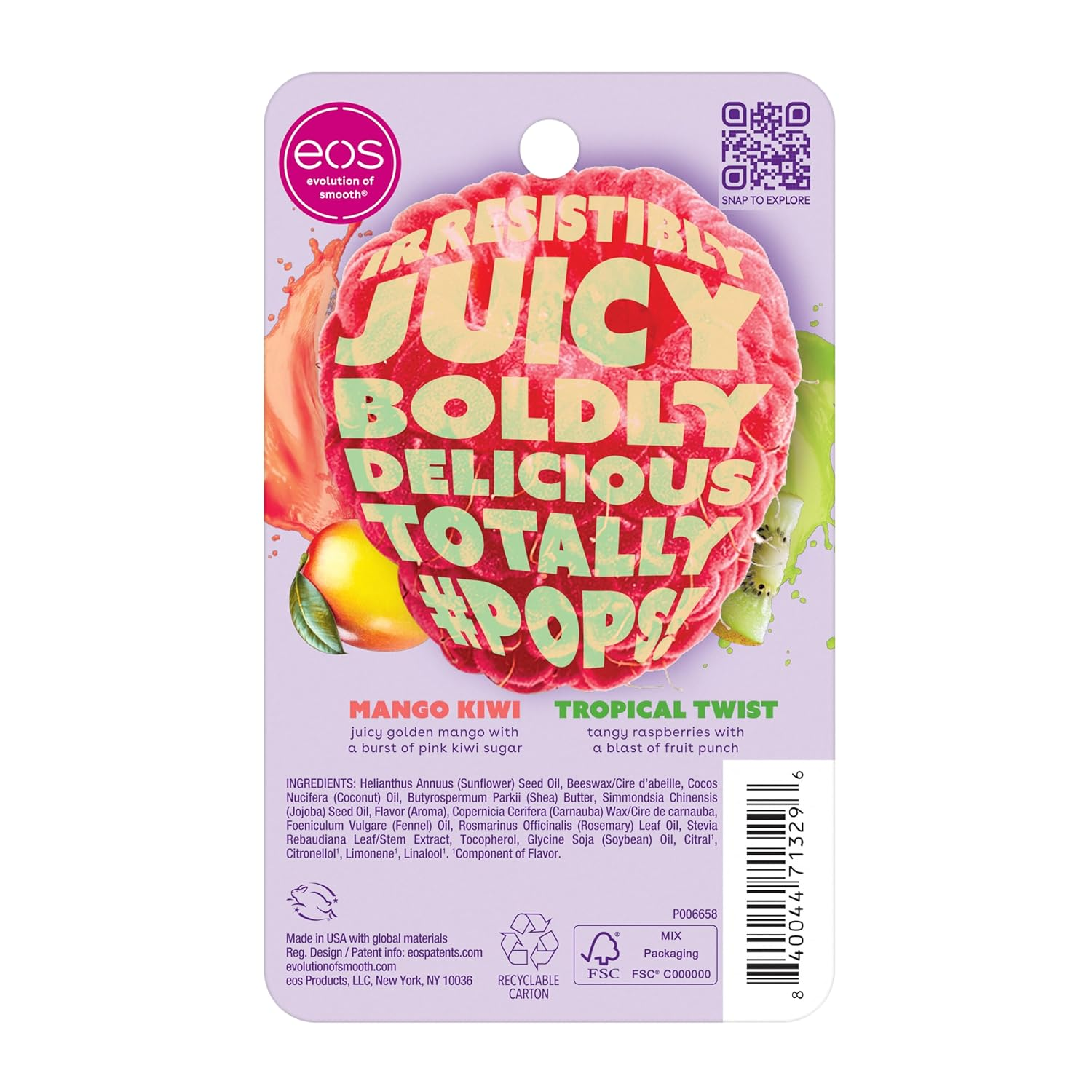 Introducing the #eosflavorlab Pops! collection, where flavor meets functionality in our limited-edition lip balms featuring Mango Kiwi and Tropical Twist. Infused with dermatologist-recommended ingredients, these balms are perfect for sensitive skin, combining soothing shea butter and lightweight coconut oil while delivering a delightful taste that lingers throughout the day. Each application not only provides all-day moisture, but also leaves your lips feeling irresistibly smooth and hydrated.
