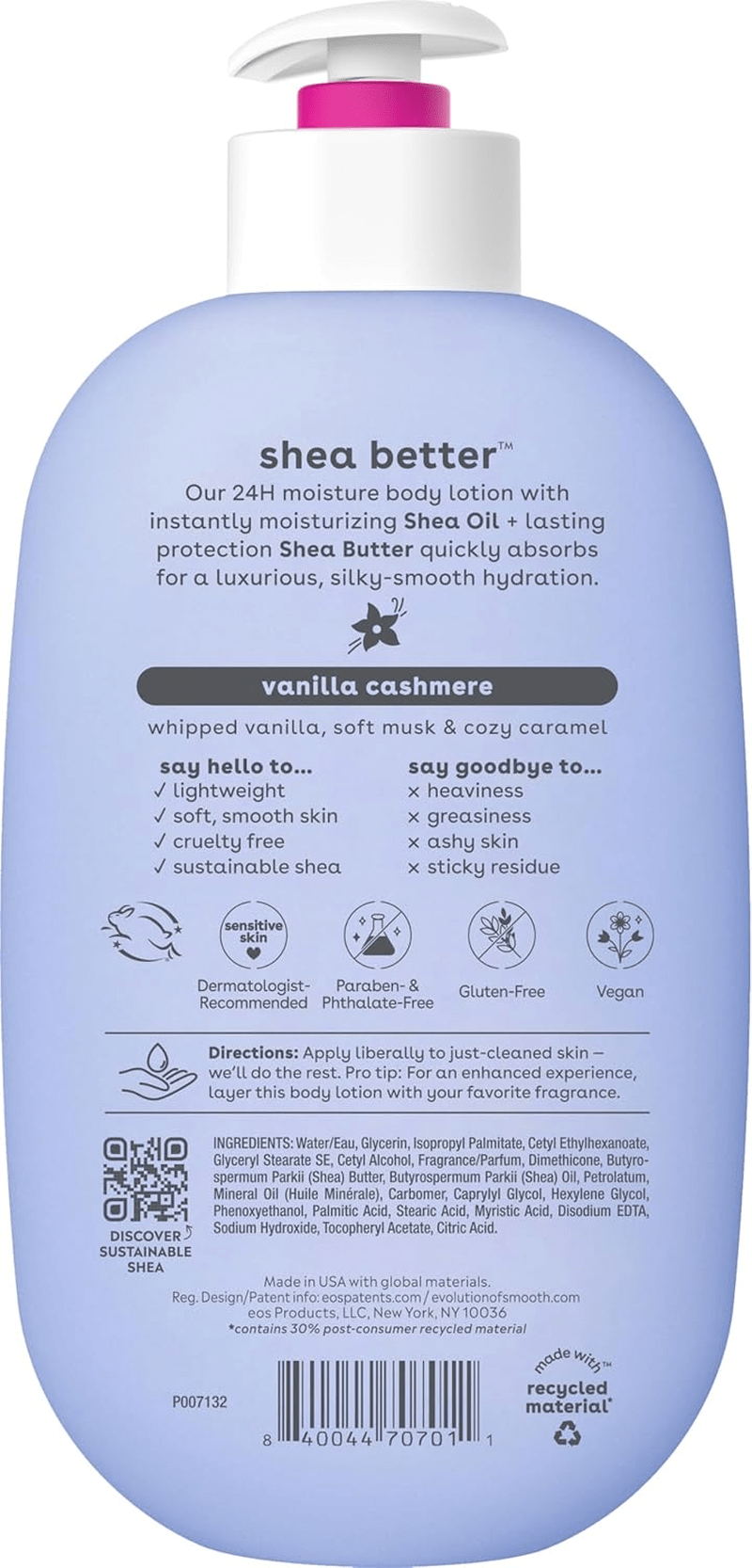 • ALL-NATURAL SHEA BUTTER: Formulated with 100% natural shea butter, eos body lotion effectively hydrates and softens the skin. Our products are free from parabens, phthalates, and gluten, and are recommended by dermatologists for being vegan, hypoallergenic, and cruelty-free.