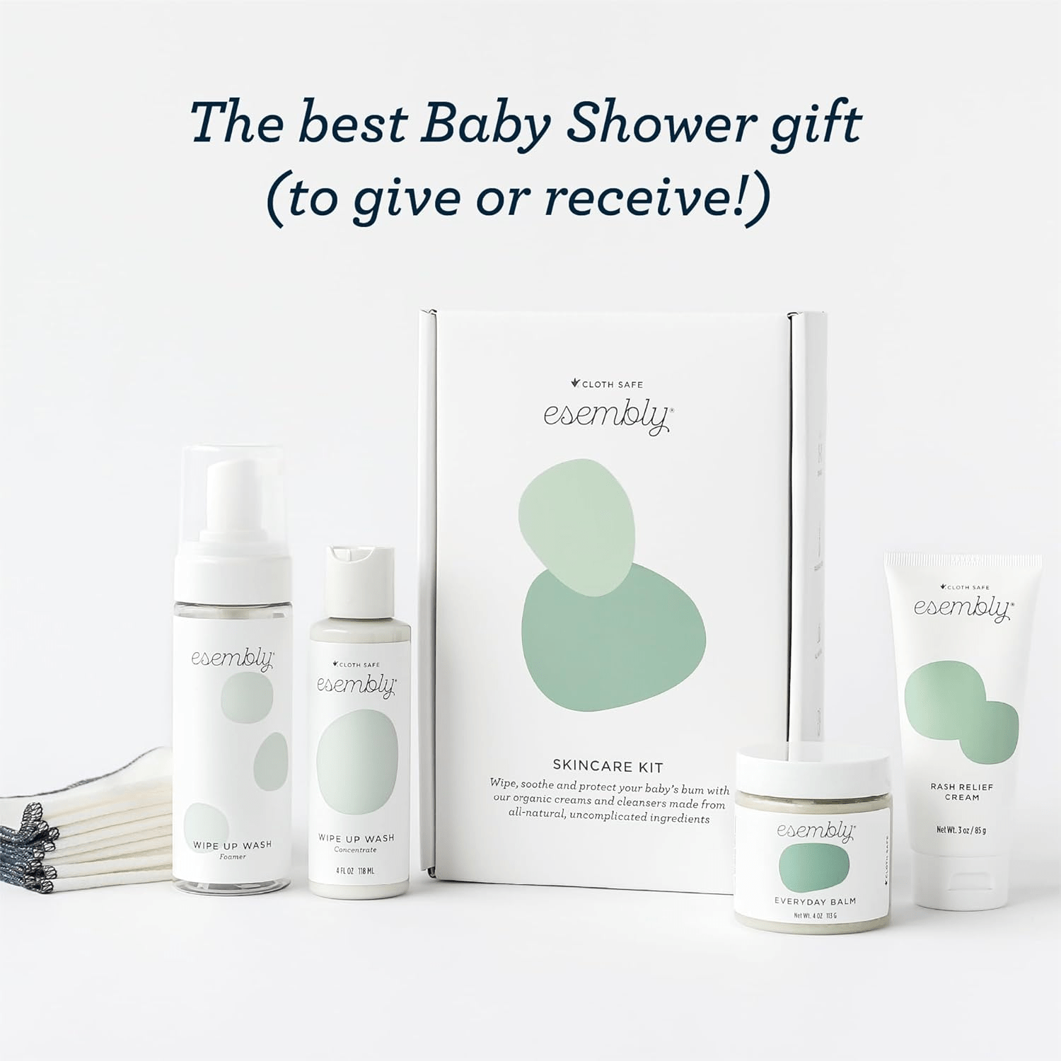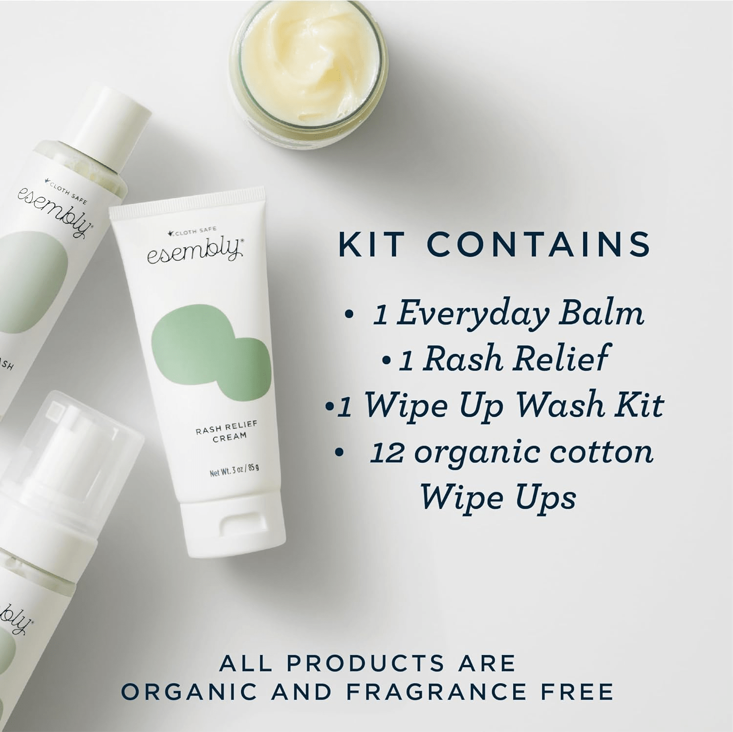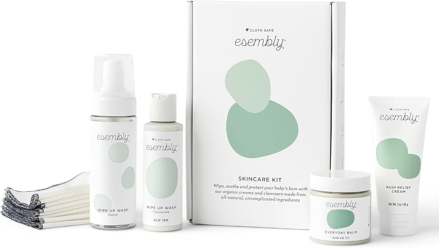 - Welcome your little one with the Esembly Skincare Kit, a thoughtfully designed gift set of organic skincare solutions perfect for new parents. This all-natural, fragrance-free collection includes everything needed to keep baby clean and comfortable during diaper changes. With a cloth-friendly everyday balm, organic diaper rash cream, a wipe-up wash cleanser with a convenient foamer bottle, and a dozen reusable organic cotton wipes, this set ensures that your baby’s delicate skin receives the gentle care it deserves.