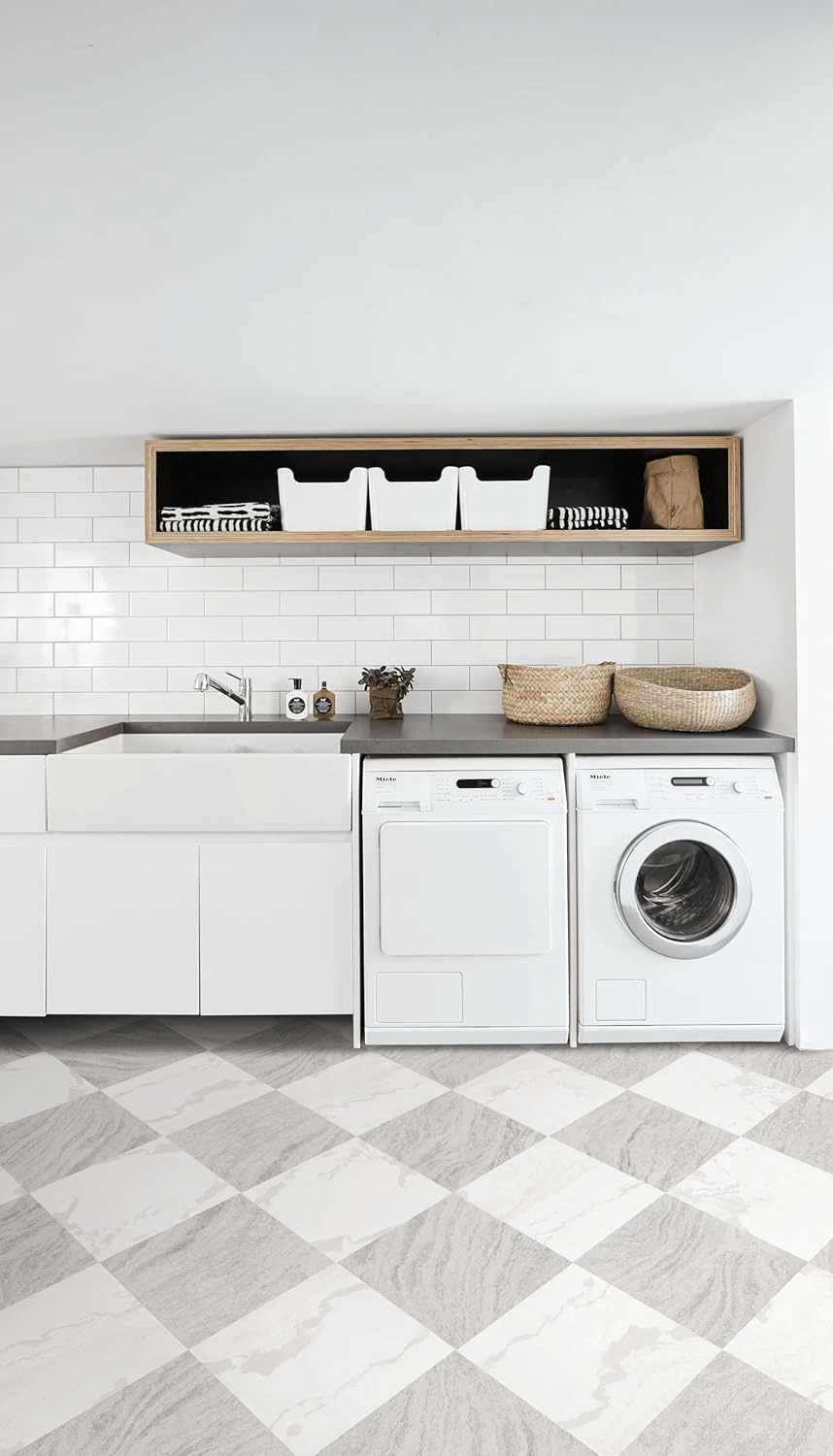 - Constructed from durable virgin vinyl with a textured low-luster finish and permanent adhesive, these tiles promise longevity and resilience. Note that a primer adhesive is advisable for installations over concrete surfaces.
