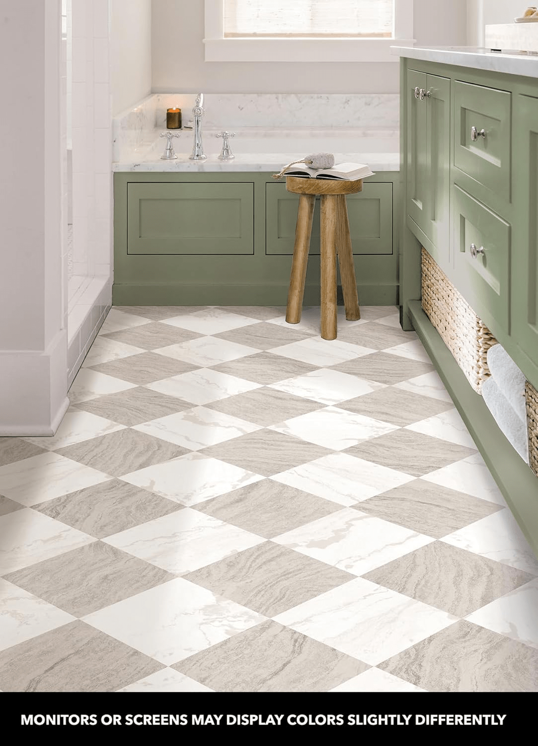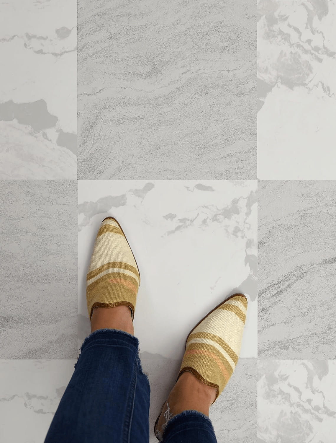- Transform your space effortlessly with these innovative peel and stick floor tiles designed by Chris Loves Julia, featuring a sophisticated beige and white marble checkerboard pattern.