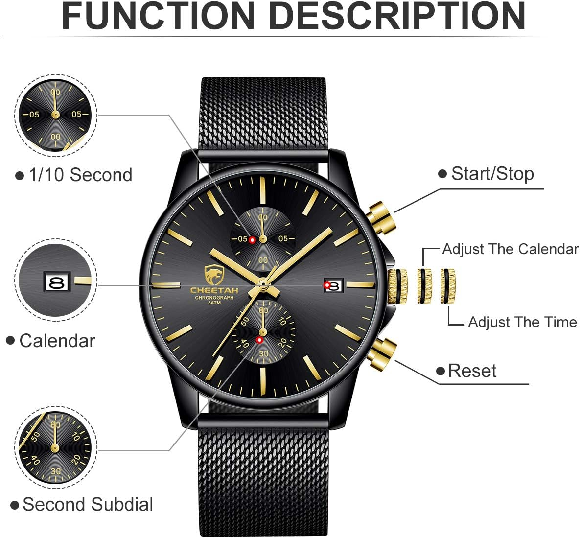 – Comfortable and adjustable mesh band with a sturdy hook buckle clasp.
