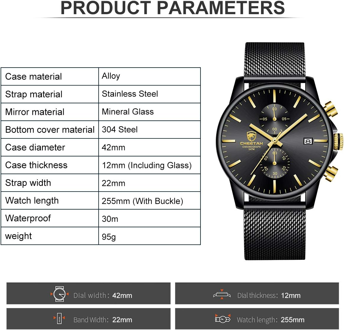 – Durable quartz movement for precise timekeeping.