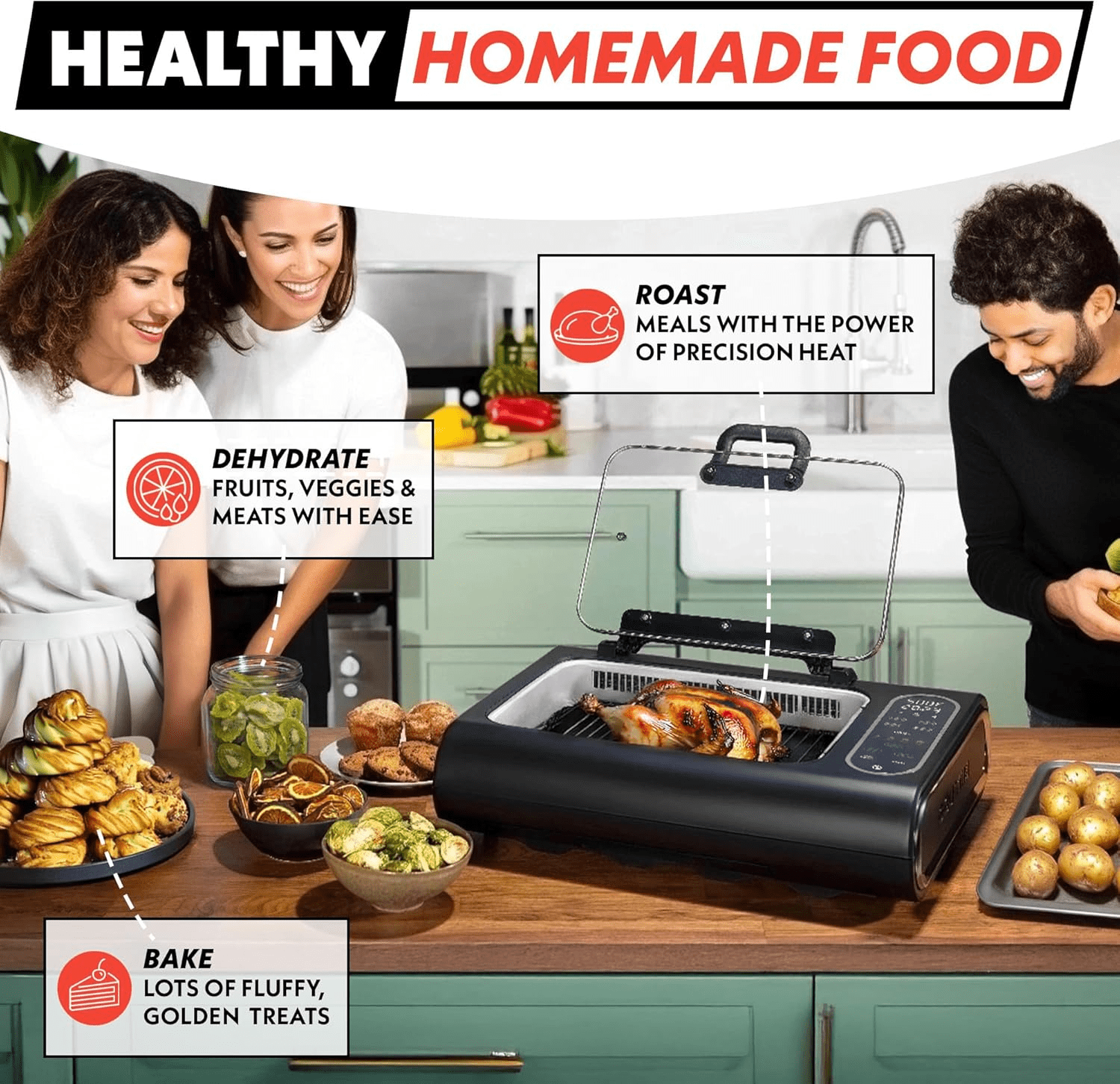 - 5 ONE-TOUCH COOKING FUNCTIONS: Grill – Air Fry – Bake – Roast – Dehydrate. 50% MORE cooking capacity than other air fryer grill combo