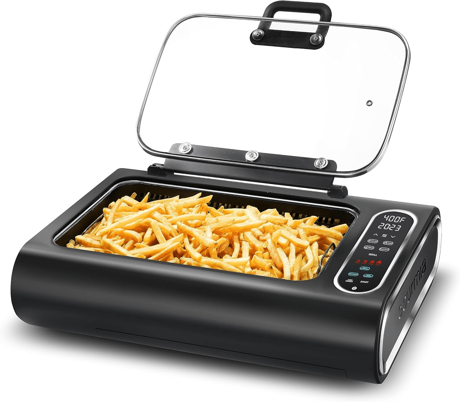 - AIR FRYER: Advanced air-flow system circulates heat from every direction, giving food authentic fried crispiness with up to 80% less fat than a deep fryer