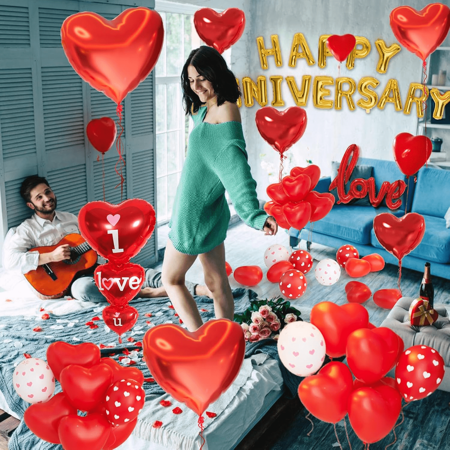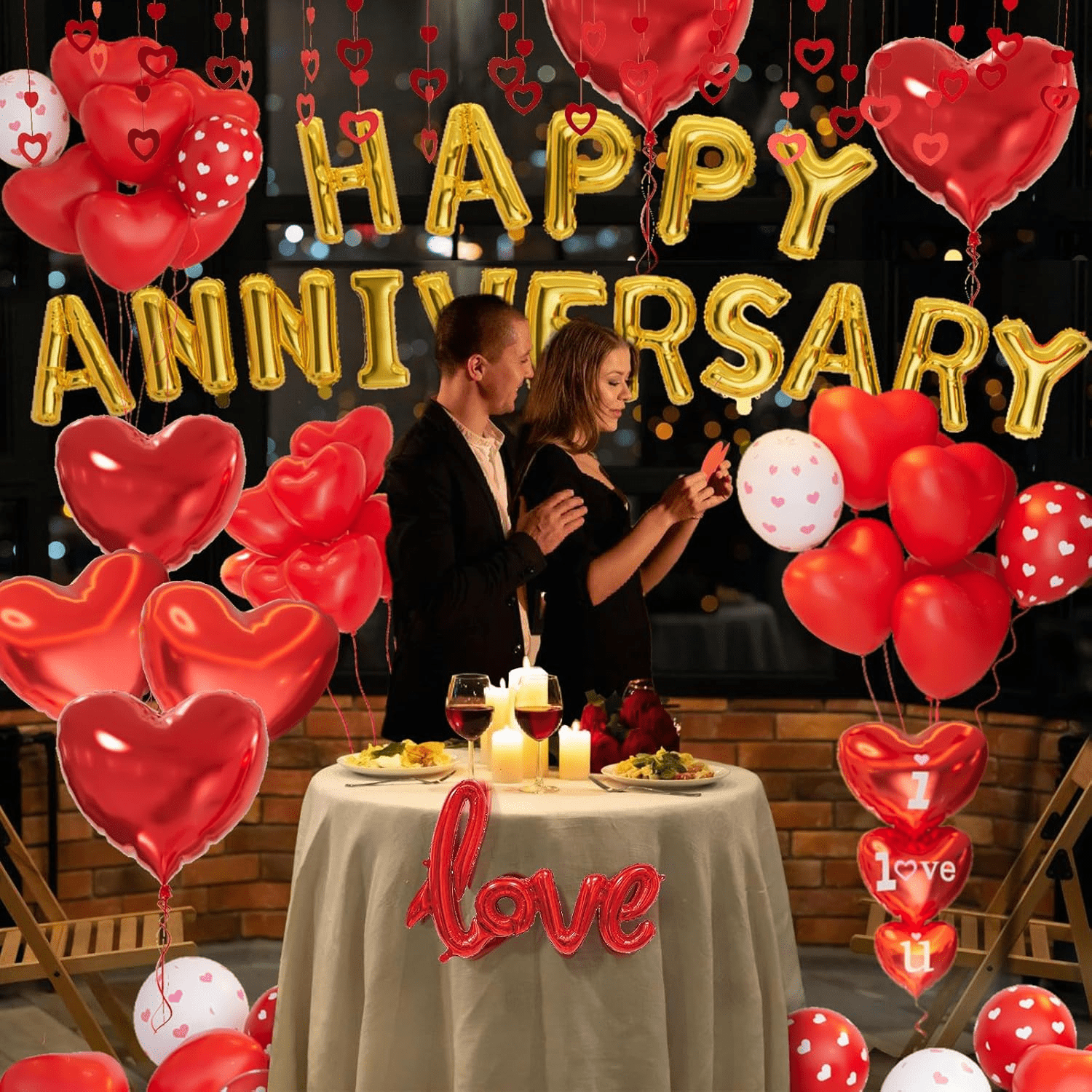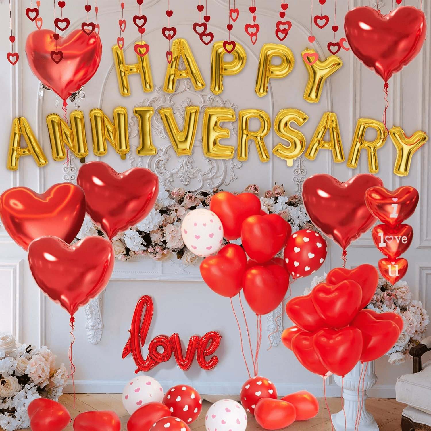 • Package Includes: Our Anniversary Decorations includes 22pcs 10 inch red heart shaped latex balloons,6pcs 12 inch red printed balloons, 6pcs 12 inch white printed balloons,6pcs 18in red foil heart balloons,1pcs 30in love letter foil balloons,16 inch happy anniversary letter balloons,1 set of I LOVE YOU balloons,50pcs balloon hanging strings,1000pcs silk rose petals,1pcs balloon Ribbon,60 points balloon glue
