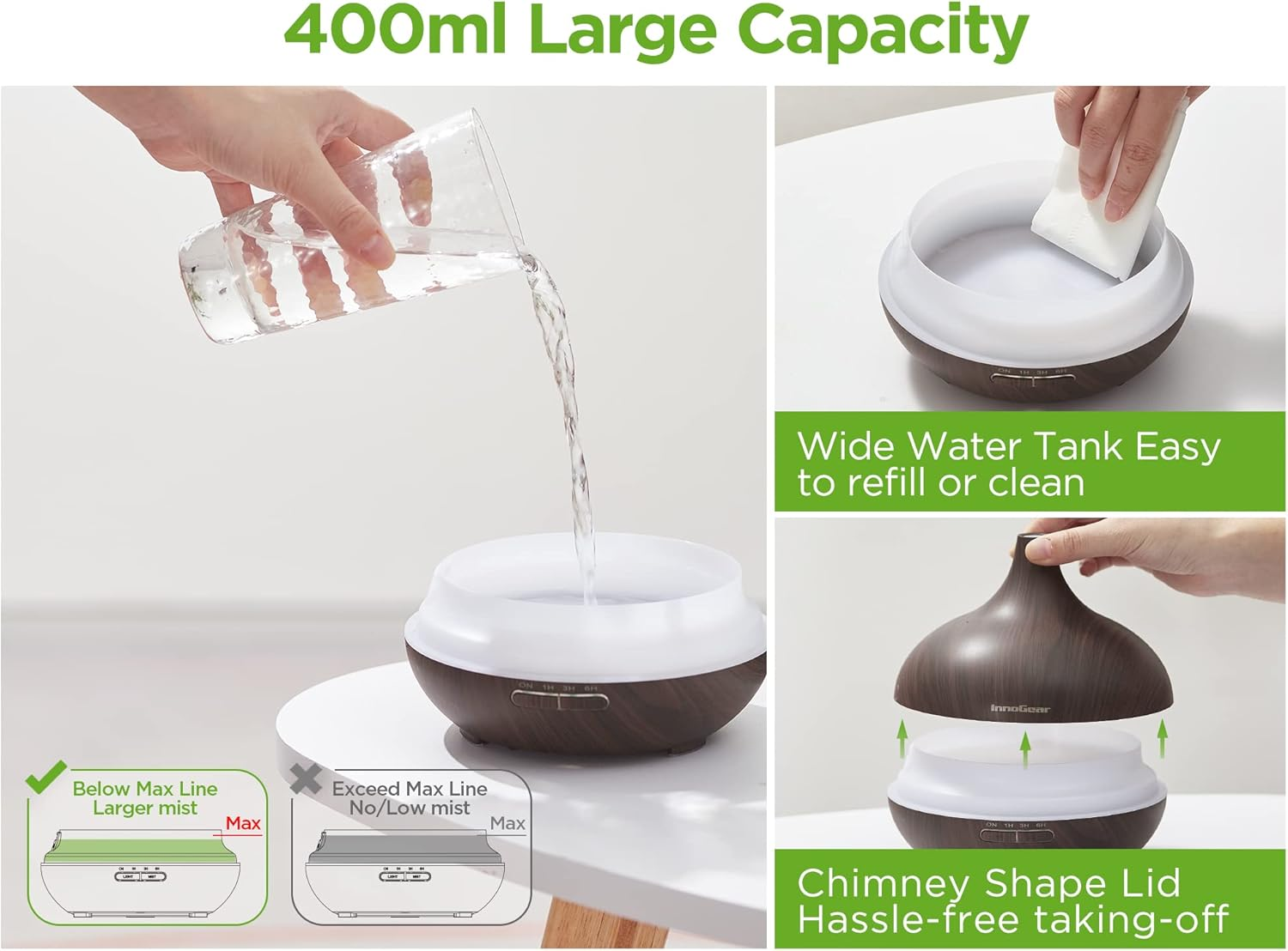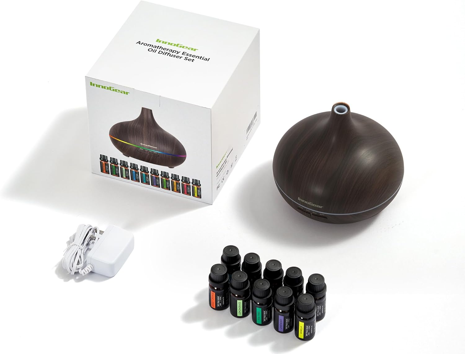 - The InnoGear Aromatherapy Diffuser and Essential Oils Set is a sophisticated solution for enhancing your living space through the soothing benefits of aromatherapy. With a generous 400ml water tank, this ultrasonic diffuser is designed to serve large rooms, offices, or any tranquil sanctuary you desire. By simply adding water and a few drops of one of the premium essential oils included in the set, you can create a revitalizing environment that promotes relaxation, focus, and overall well-being. The diffuser comes equipped with four timer settings and two mist levels, allowing you to customize your aromatherapy experience according to your preferences.