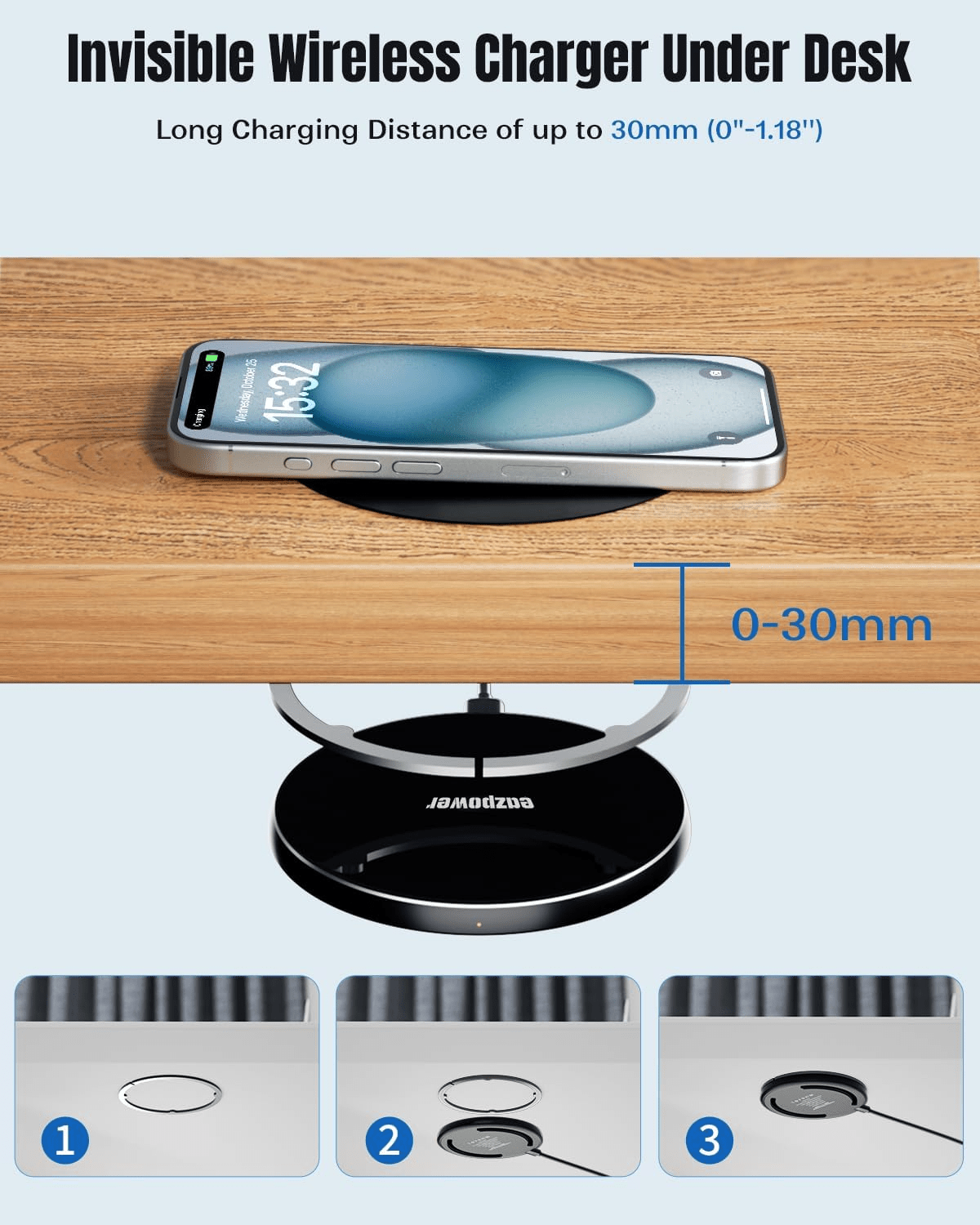 Invisible Wireless Charger, 0-30Mm under Desk Wireless Charger, Dual Uses on or Hidden under Table Charging Pad for Nightstand for Iphone 17/17 Pro/17 Pro Max/17 Air/16/15/14/Samsung Phone
