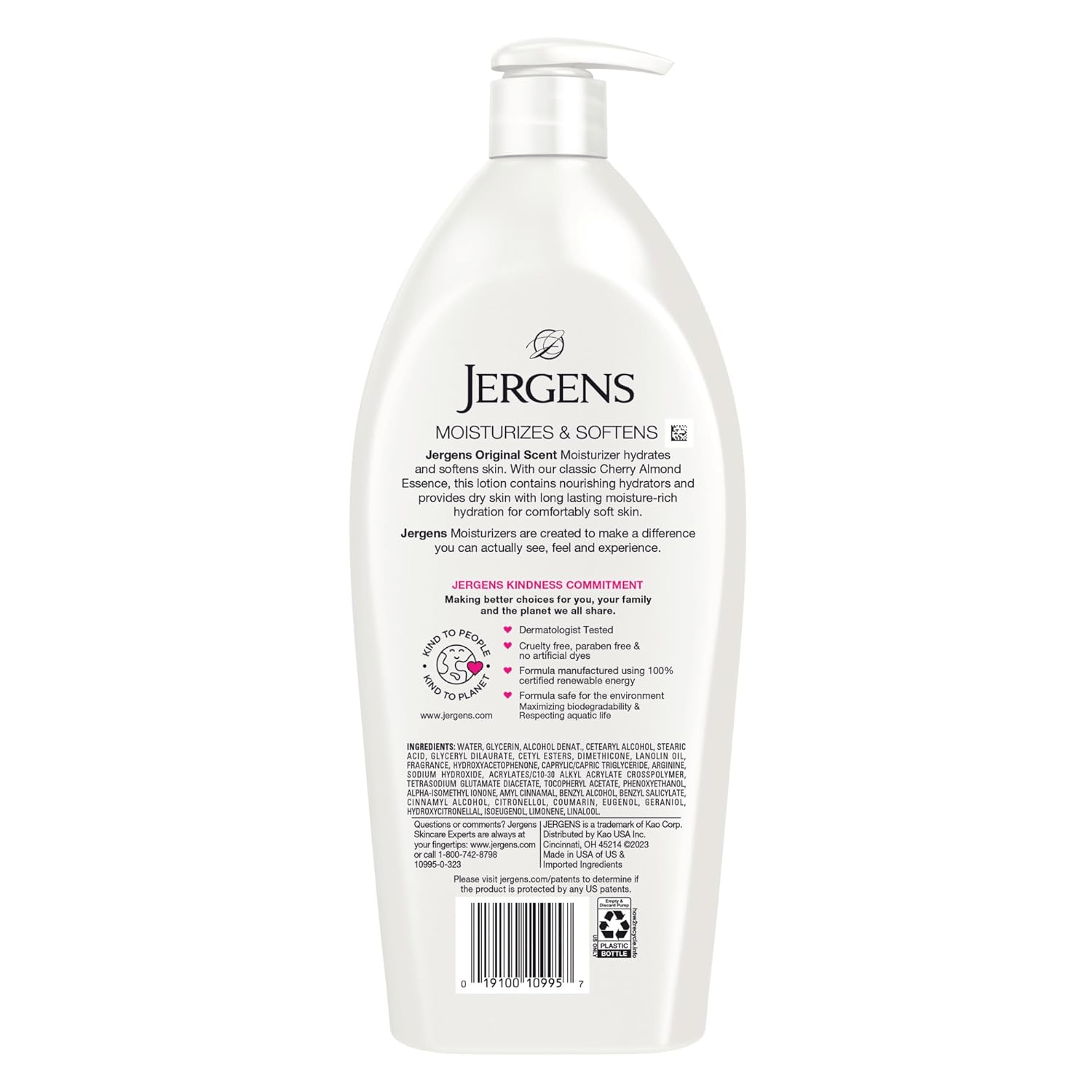 Reveal softer, more radiant skin when you smooth on Jergens Original Scent Dry Skin Body Moisturizer with Cherry Almond Essence. It provides long-lasting, moisture-rich hydration and noticeably softer, smoother skin. Our formula, with a unique HYDRALUCENCE blend, nourishing hydrators, and Jergens Cherry Almond essence, leaves skin deeply luminous and lightly scented. Jergens hand and body lotion for women and men is carefully formulated for optimal dry skin relief. Jergens hand lotion with pump hydrates and moisturizes dry and cracked hands for extra dry skin relief. Body cream for women and men soothes skin for long lasting hydration. Hand cream for dry cracked hands rejuvenates cracked skin for optimal moisture. Satisfaction Guaranteed. Limitations may apply.