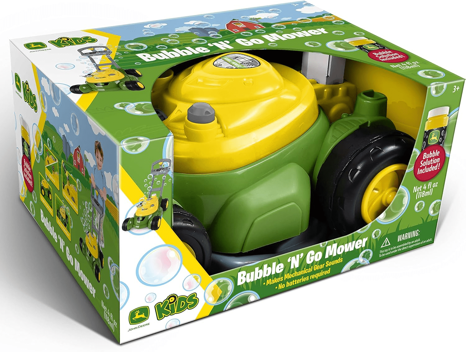 Turn your yard into a world of bubble fun with the John Deere Bubble-N-Go Mower. This toy is designed for kids ages 3 and up who are eager to imitate their favorite adult and join in the yard work fun. Inspired by real life John Deere mowers, this playful toy has true-to-life features and mechanical sounds bring imagination to life. Each push creates a trail of bubbles that make yard work instantly fun! Simply fill with the included bubble solution and push and let the bubbles fly. As they play, kids will be learning and developing responsibility, motor skills and creativity all through active, pretend play. No batteries required when ‘mowing’ the lawn – it’s all kid power. Push the bubbles into action and create countless memories!