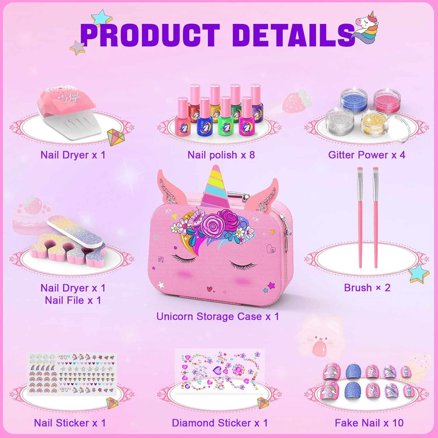 - 【All In One Kids Nail Polish Kit】This adorable nail art kit is specially designed for little girl to fulfills their dream of charming nail art, including 8 nail polishes, 1 pink storage case, 1 nail dryer, 1 toe separator, 1 glitter power, 1 nail file, 2 brushes, 1 nail sticker, 1 diamond sticker, 10 fake nail; sufficient quantity and diverse styles to meet your needs.
