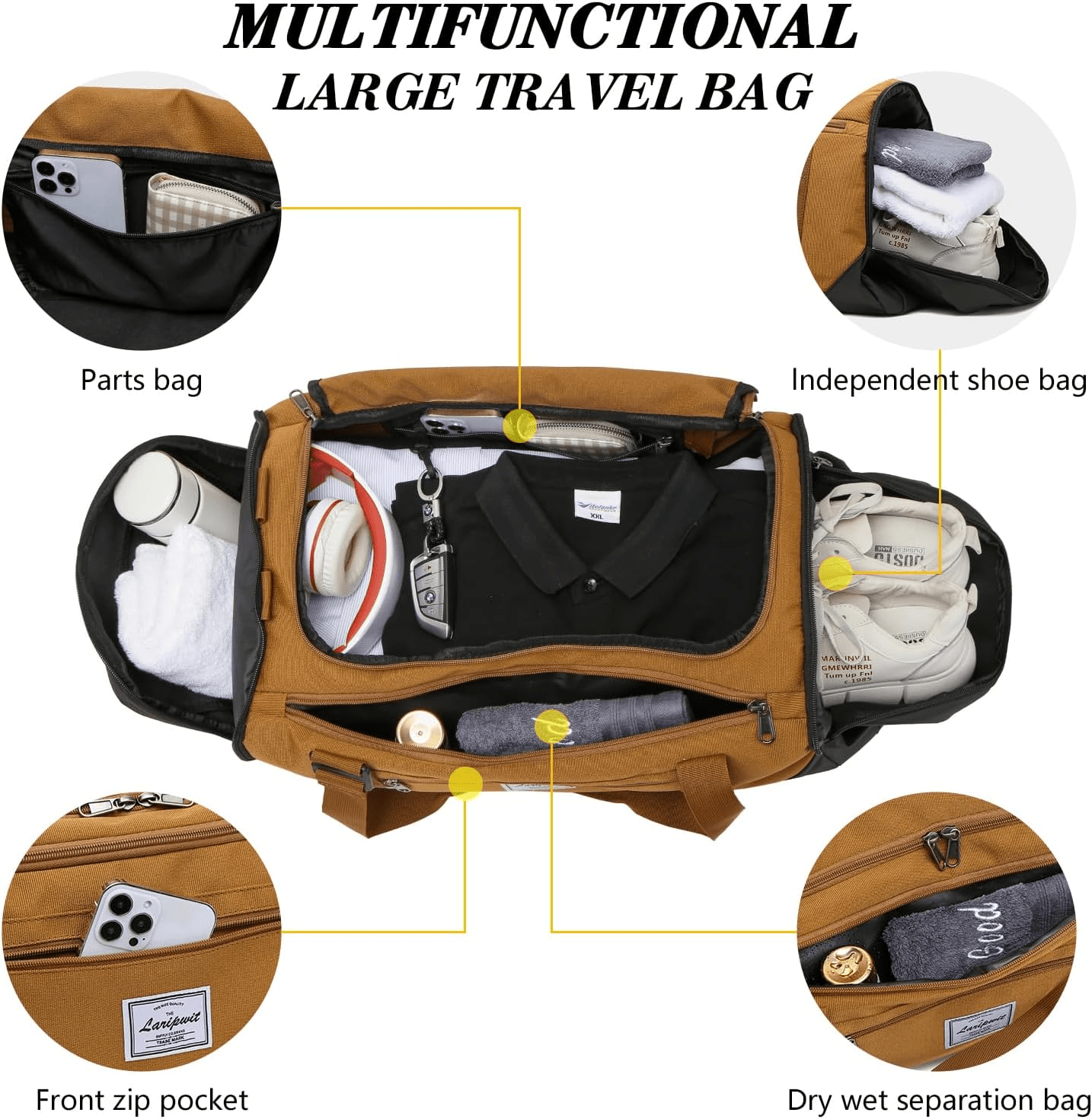 Laripwit Gym Bags for Men, 40L Medium Sports Travel Duffel Bag with Shoe Compartment & Wet Pocket Lightweight Gym Duffle Bag Backpack Multipurpose Weekender Overnight Backpack for Women, Brown
