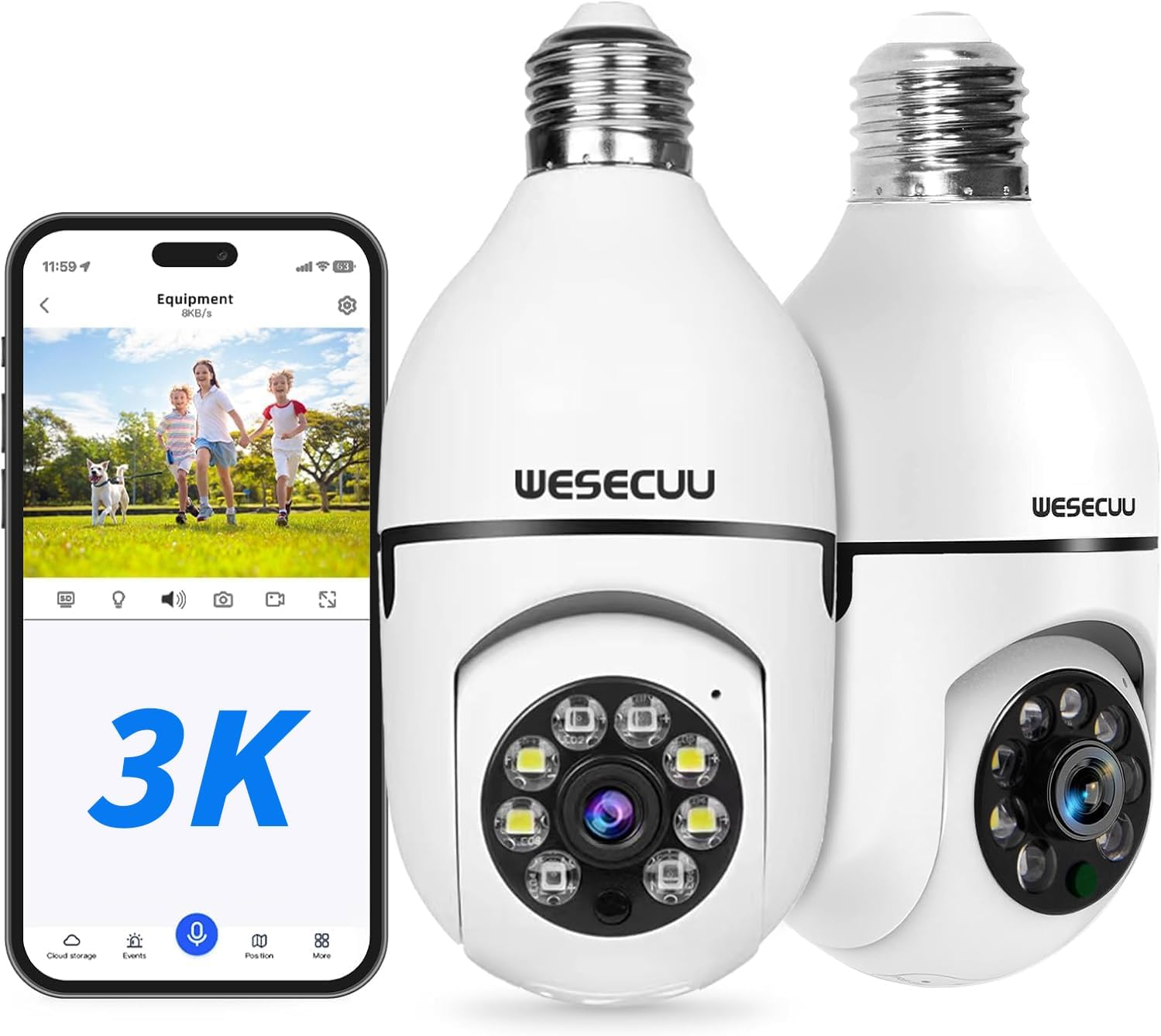 The WESECUU Light Bulb Security Camera is a pioneering solution that seamlessly integrates advanced surveillance technology into a standard light bulb design. This innovative camera operates on both 5G and 2.4GHz Wi-Fi bands, providing enhanced signal reception, stability, and extended range. Installation is a breeze; simply screw the bulb camera into the E27 bulb base and plug it into a power outlet. After downloading the EseeCloud APP, you can easily connect the camera to your home Wi-Fi, allowing you to monitor your property from anywhere. This product not only acts as a light source but also ensures optimal safety around your home both day and night.