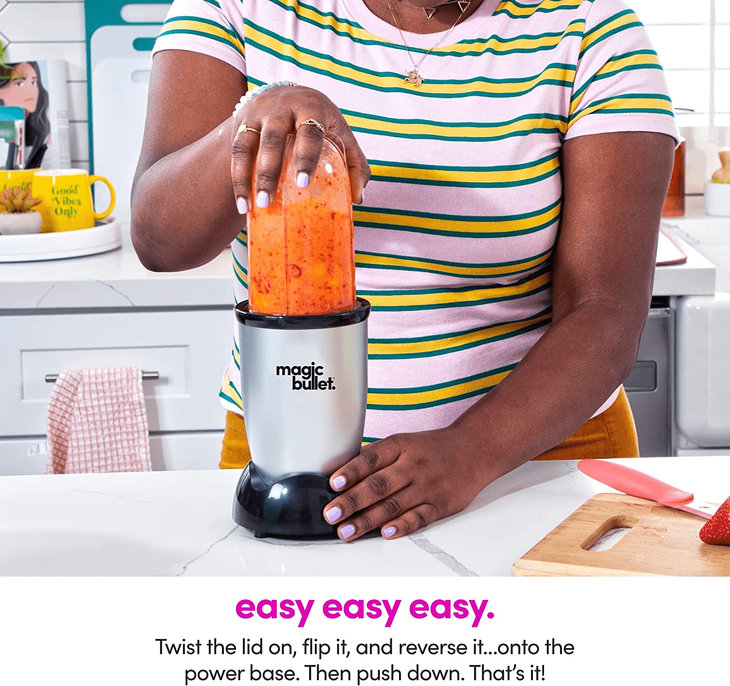 Magic Bullet 11-Piece Set Blender & Food Processor for Kitchen with Over 40 million Bullets sold! Make it fast by keeping it simple. Does any job in 10 seconds or Less! Hi-speed blender & mixer. 10 second recipe book included. Like your personal kitchen food processor & blender assistant. Do it all with hi-speed blender & mixer system. Chop, Mix, Blend, Whip, Grind, and Mince. Handy versatile and easy to use, the Magic Bullet Blender & Food Processor takes up minimal counter space while showcasing maximum speed and versatility. With its unique design and compact size, the Magic Bullet Blender & Food Processor chops, mixes, blends, whips, grinds and more in less time than it takes to assemble standard kitchen appliances. Make the perfect smoothies and milkshakes, frozen cocktails, and pureed soups super easily! And with a wide array of dishwasher-safe attachments, clean-up is as easy as it gets. The secret to the Magic Bullet’s time-saving efficiency is its specially designed blade and unique bullet shape. These features work together too quickly and forcefully circulate food back into the Cyclonic Cutting Zone, allowing the Magic Bullet to do virtually any food prep task in seconds.