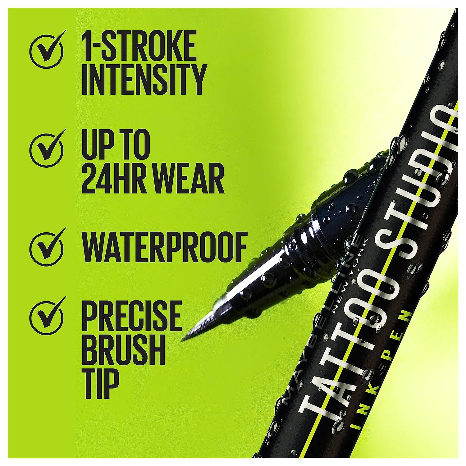 - Introducing the Maybelline Tattoo Studio Ink Pen Liquid Eyeliner, expertly designed for makeup enthusiasts seeking unparalleled performance. This waterproof eyeliner boasts a fade-resistant, smudge-resistant, and flake-resistant formula that ensures your look remains perfect from morning to night. With a single stroke, you can achieve impressive intensity that lasts up to 24 hours, making it an essential addition to your makeup routine.