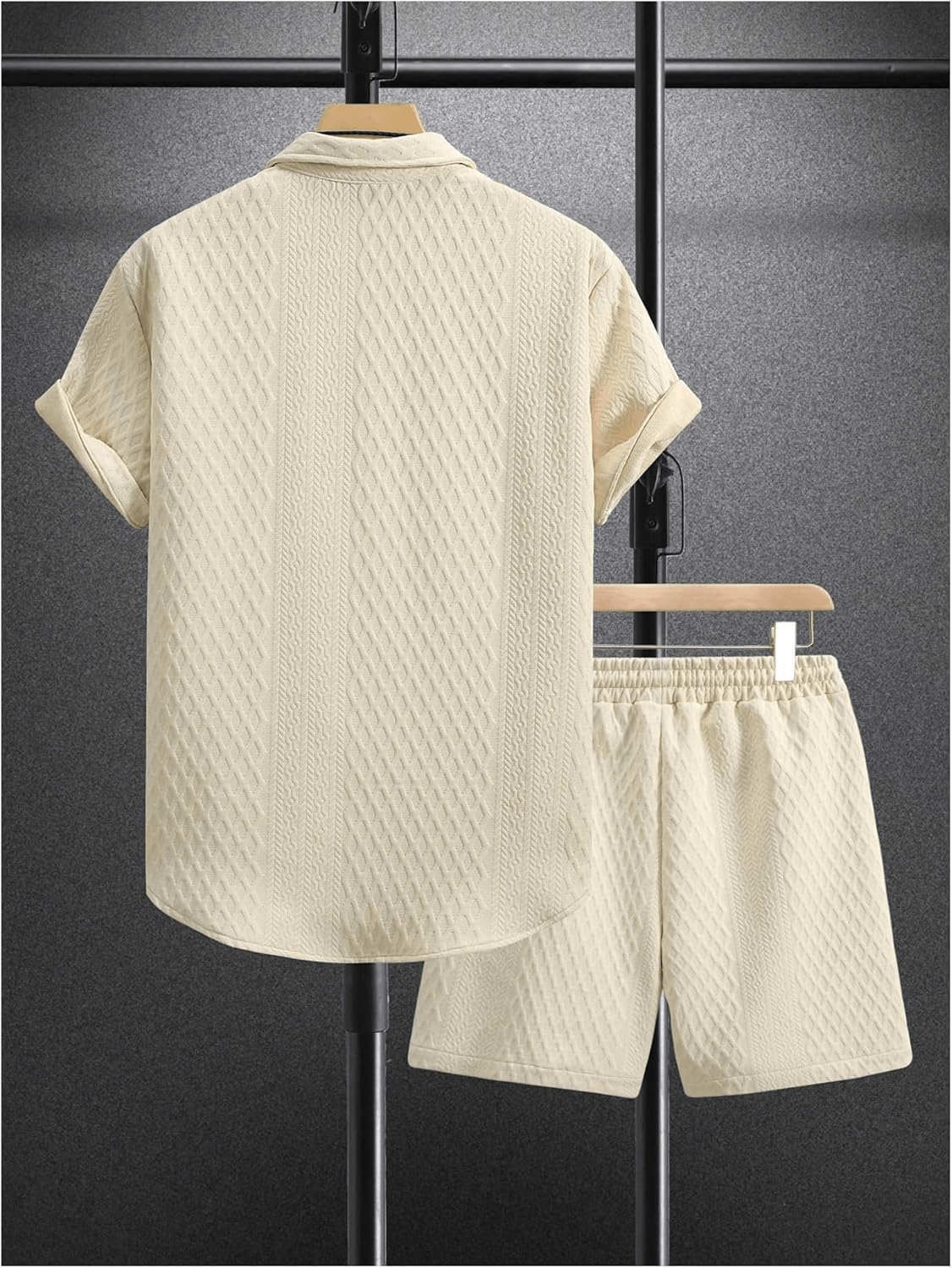 - The top in the beach outfits features unique knitting texture, turn down collar, short sleeve, button down closure. The board shorts feature an elasticated drawstring waist and side deep pockets perfect for carrying your phone, keys, sunglasses or cards. Comfortable and stylish.