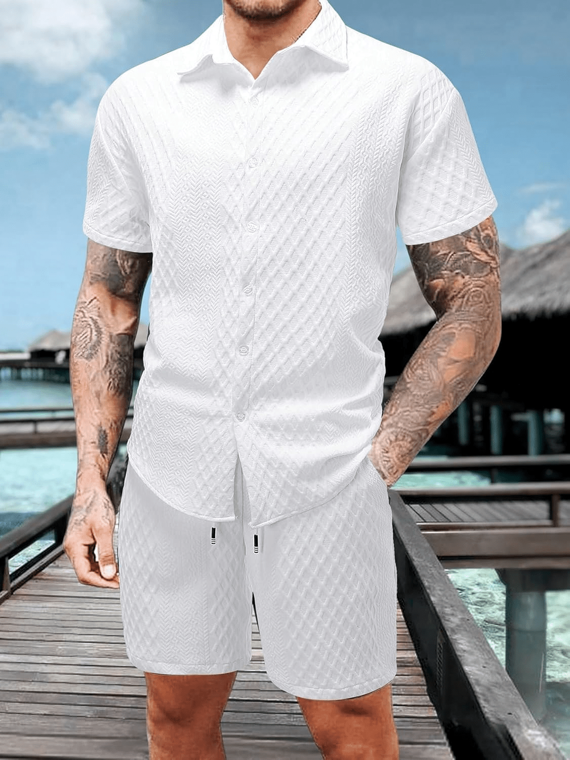 - The top in the beach outfits features unique knitting texture, turn down collar, short sleeve, button down closure. The board shorts feature an elasticated drawstring waist and side deep pockets perfect for carrying your phone, keys, sunglasses or cards. Comfortable and stylish.