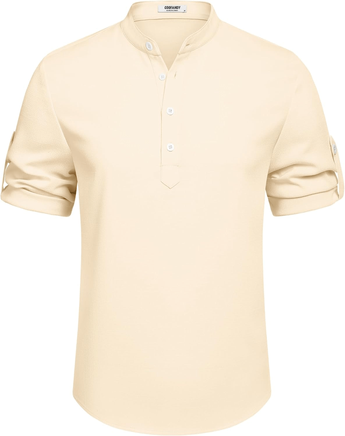 Add easy sophistication to your summer wardrobe with the COOFANDY Men’s Casual Henley Band Collar Shirt. Designed for warm days and relaxed occasions, this short sleeve shirt is perfect for beach outings, vacation strolls, or weekend brunch.